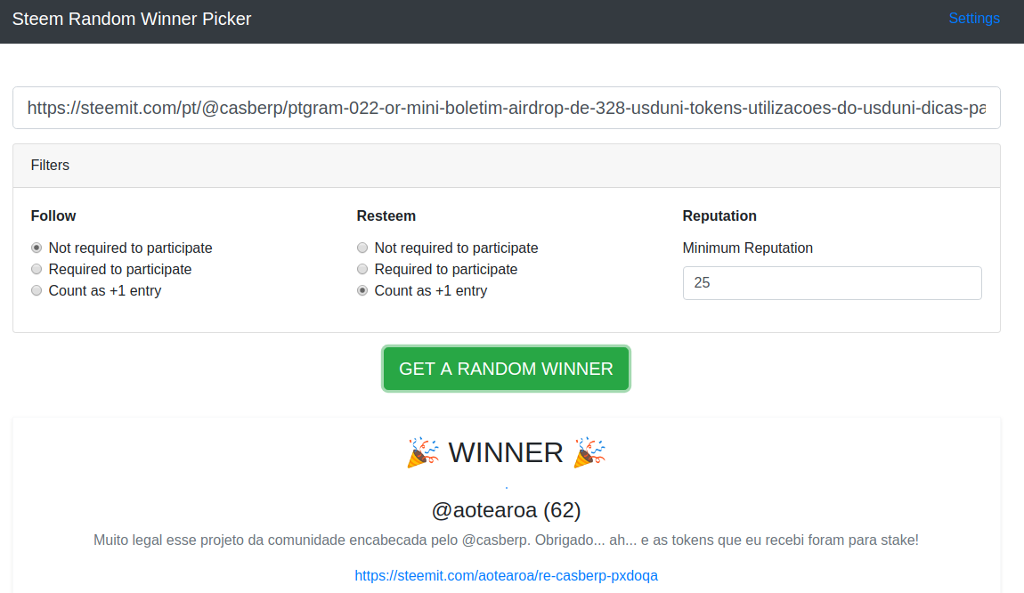 CONFORME PROMETIDO, SEGUE O RESULTADO DO SORTEIO, FEITO PELO SITE https://picker.steemify.me/