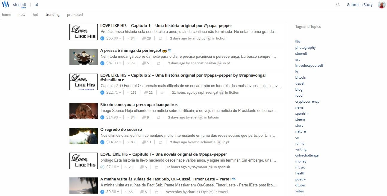Isso é no mínimo fantástico! A nossa tag de língua portuguesa "PT" já se encontra no "hall" das tags principais do Steemit. Isso para a comunidade de língua portuguesa do Steemit que reúne brasileiros, portugueses, angolanos, moçambicanos e timorenses com certeza é um orgulho. Isso mostra que temos com certeza muito potencial para poder crescer aqui no Steemit.