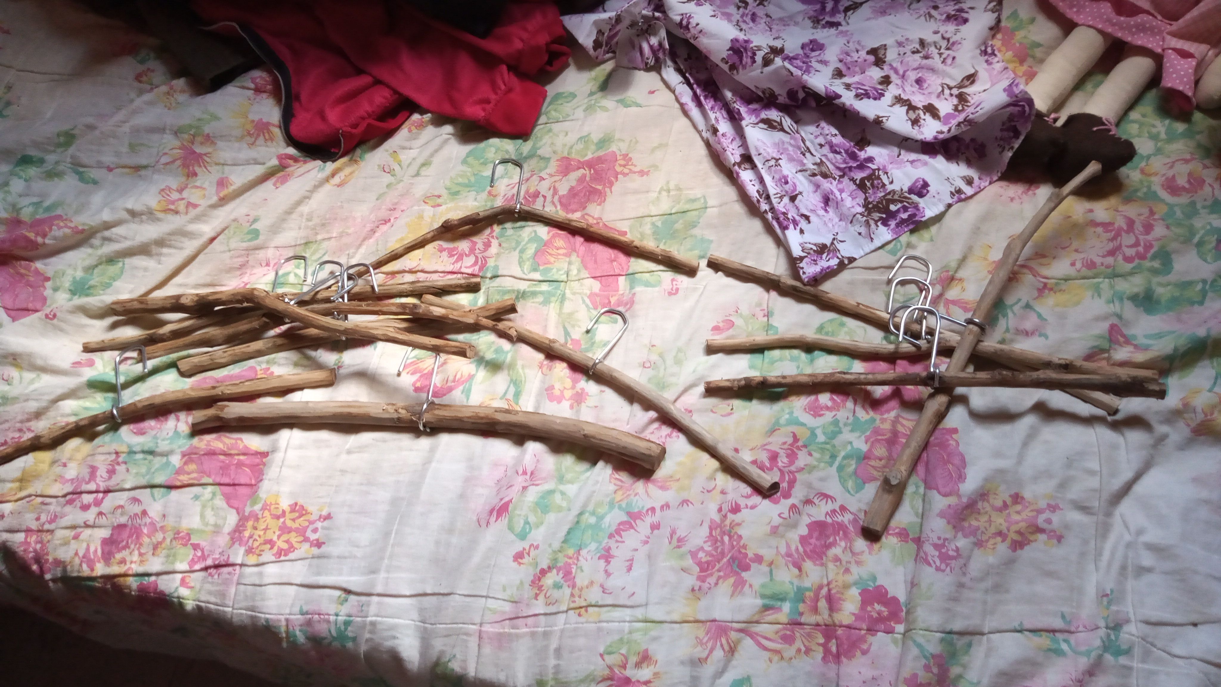 Depois de cortar e furar todos os galhos nós descascamos com a faca e colocamos os ganchos em 12 galhos (vamos terminar o restante hoje) e então os levei para o quarto da minha filha, que por sua vez amou a novidade.