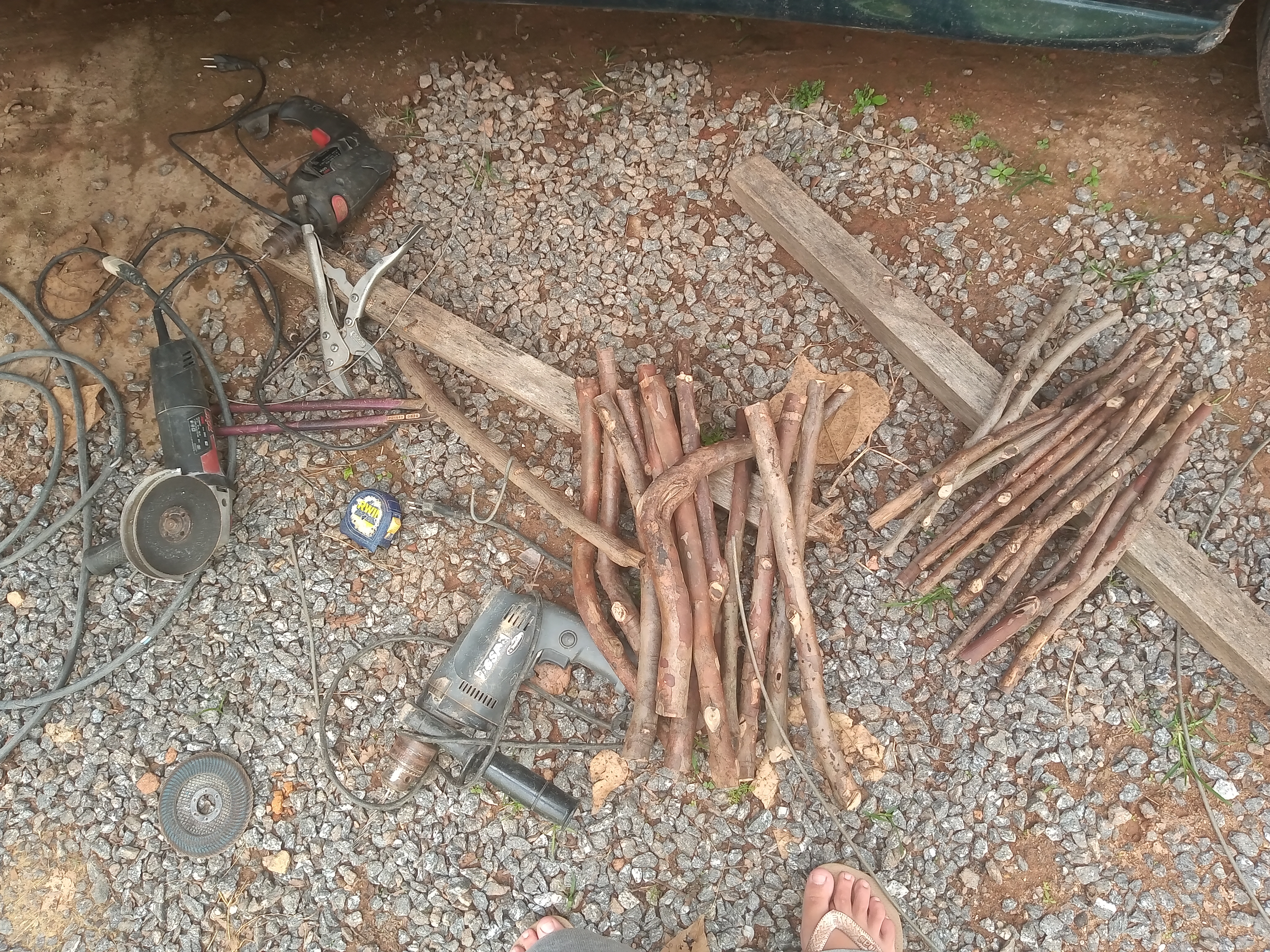 Depois de escolhe-los nós os cortamos em 30cm e 35cm e os furamos.