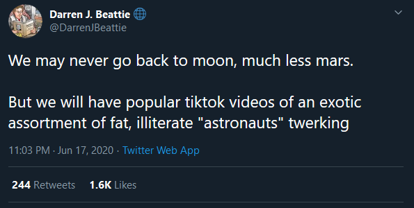 Na imagem: Talvez nunca mais voltemos à Lua, muito menos chegaremos a Marte. Mas teremos uma coleção de vídeos de exóticos, gordos e iletrados "astronautas" populares no tiktok