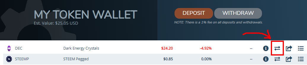 Passo 1 - Entre e faça login em https://steem-engine.com. No menu superior, clique em wallet, depois clique nas setinhas na linha do DEC. É o símbolo de trade (troca). Quando mudar a tela, role a página para baixo.