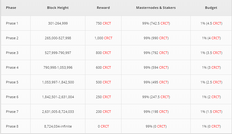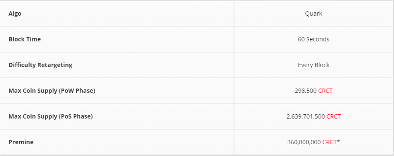 A criptomoeda é de código aberto e está construida, utilizando o algoritimo de consenso Proof of Stake com um sistema implementado de Masternodes. A abreviação usada é CRCT e tem o suprimento máximo de 3.000.000.000 de moedas.