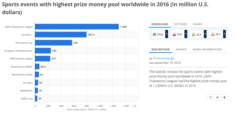 Formula Um é uma das modalidades mais populares de automobilismo. É a categoria mais avançada do esporte a motor e é regulamentada pela Federação Internacional de Automobilismo. São investidos milhões, nessa indústria, como você pode conferir nesse gráfico, fornecido pela Statista, os eventos esportivos com o mais alto prêmio em dinheiro no mundo em 2016: