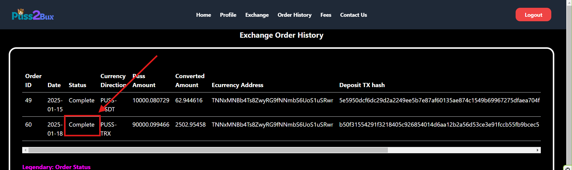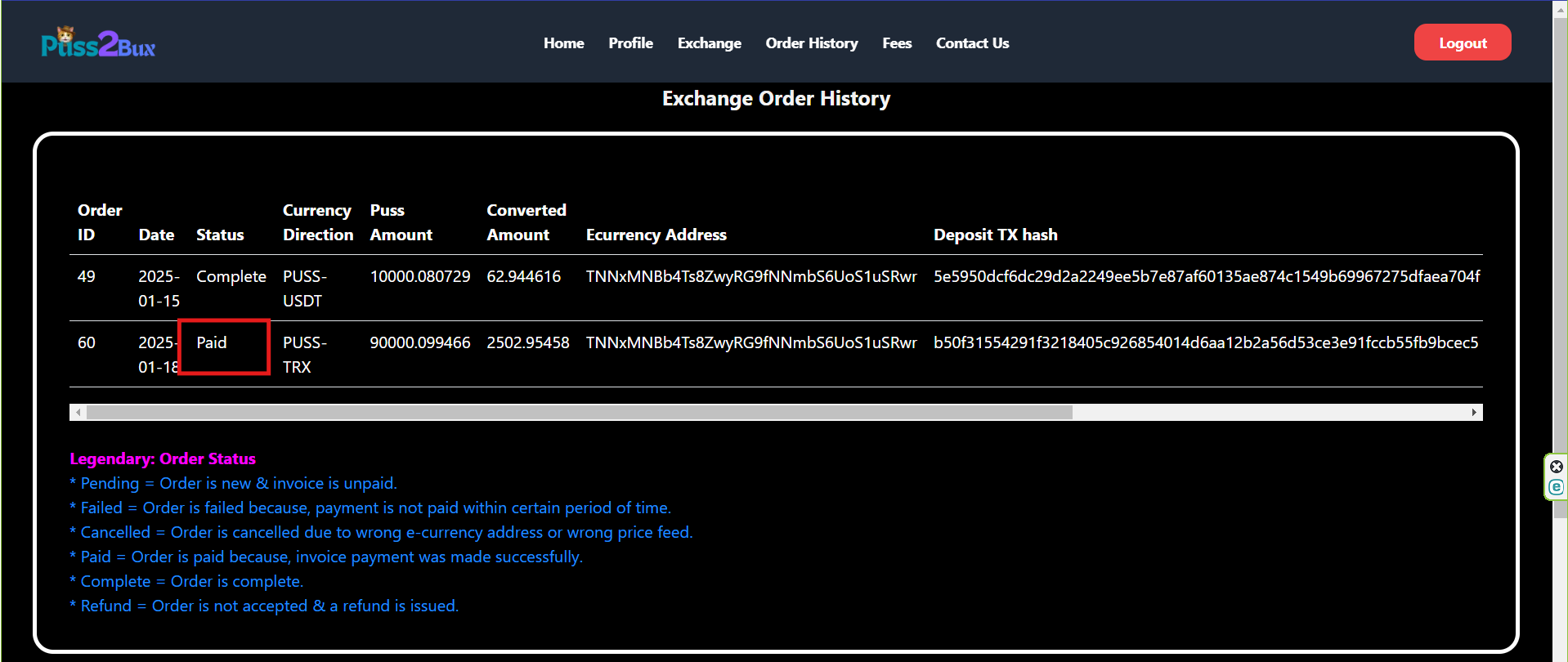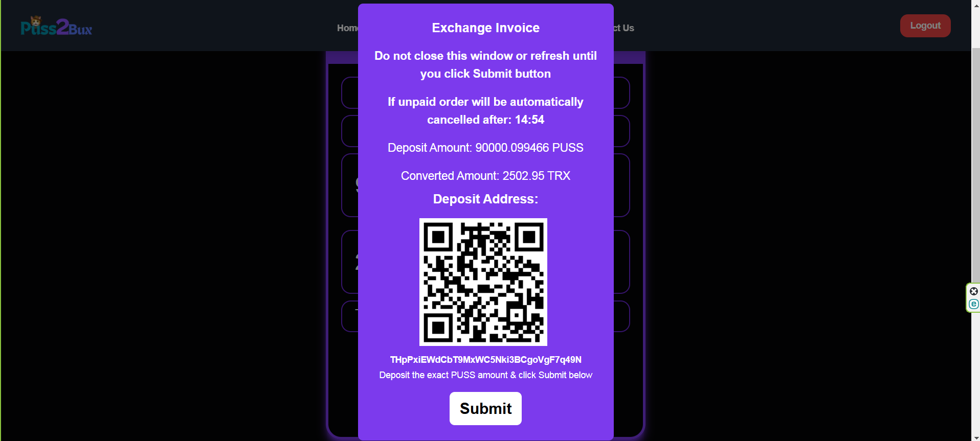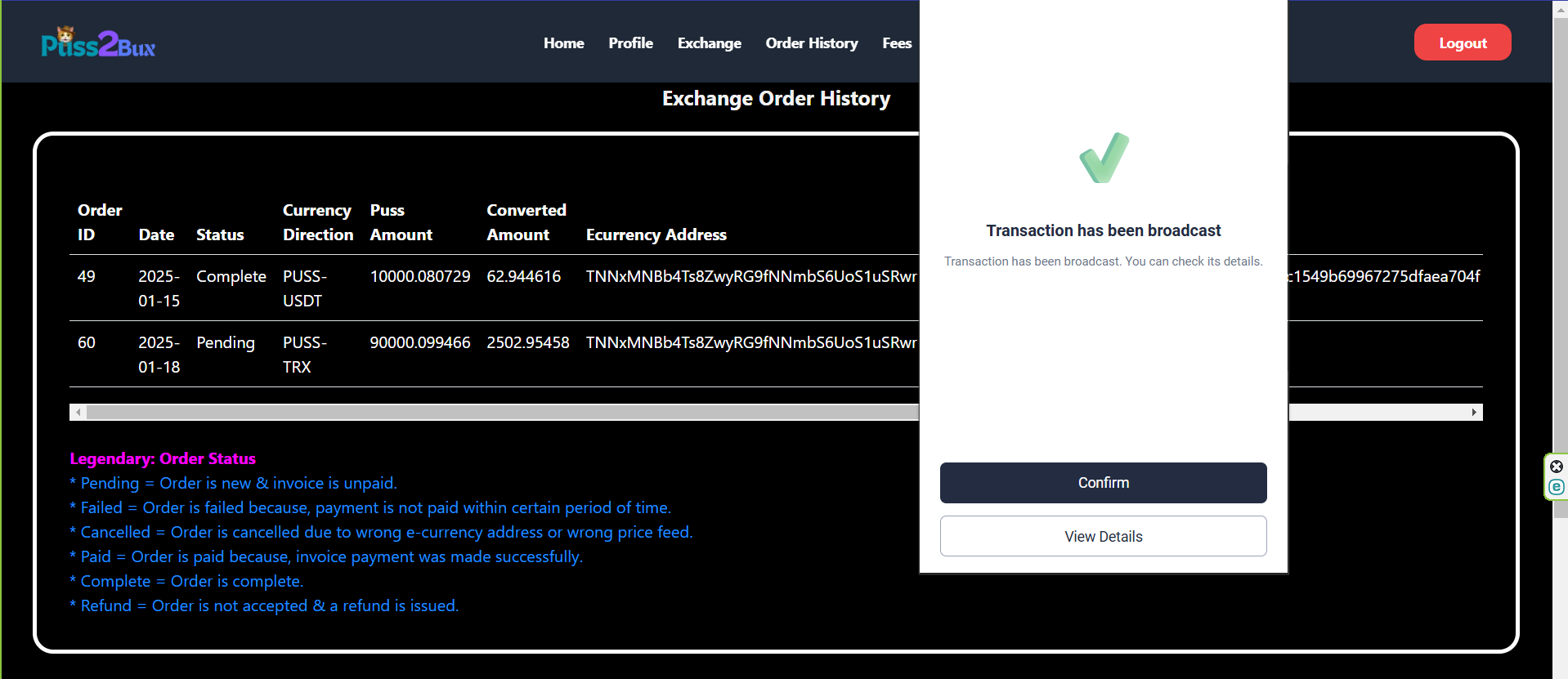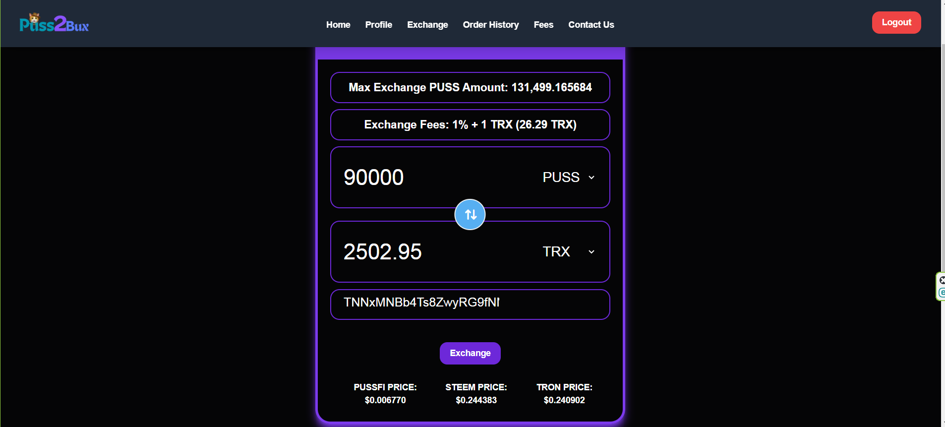 • এরপরে এক্সচেঞ্জ অপশনে ক্লিক করে কতটুকু PUSS সেল করবো সেই অ্যামাউন্ট দিয়েছি এবং সেটা TRX এ নেব সেটাও দিয়েছি। সর্বশেষে TRX অ্যাড্রেসটা দিয়ে নিয়েছি।