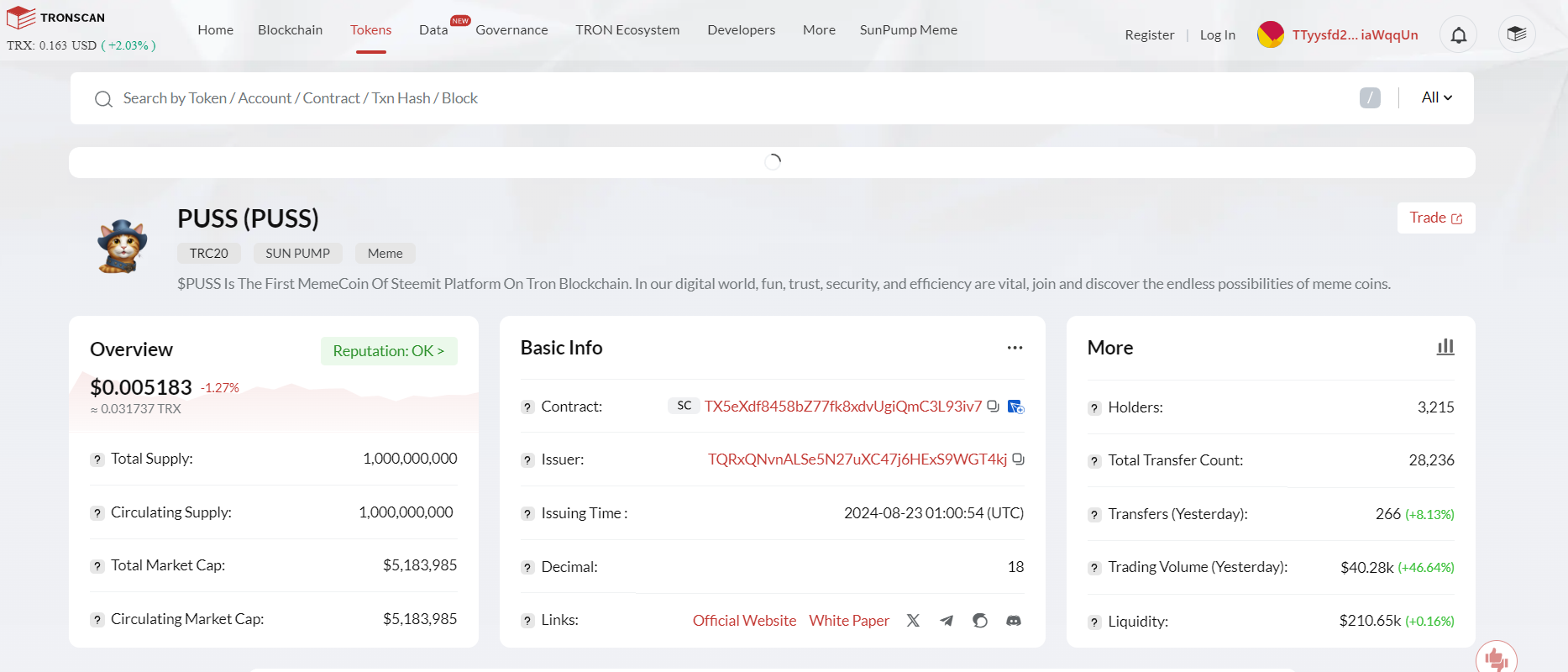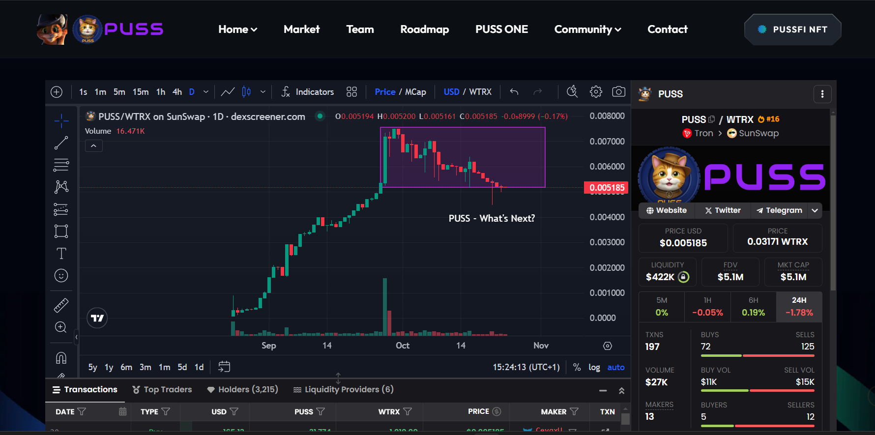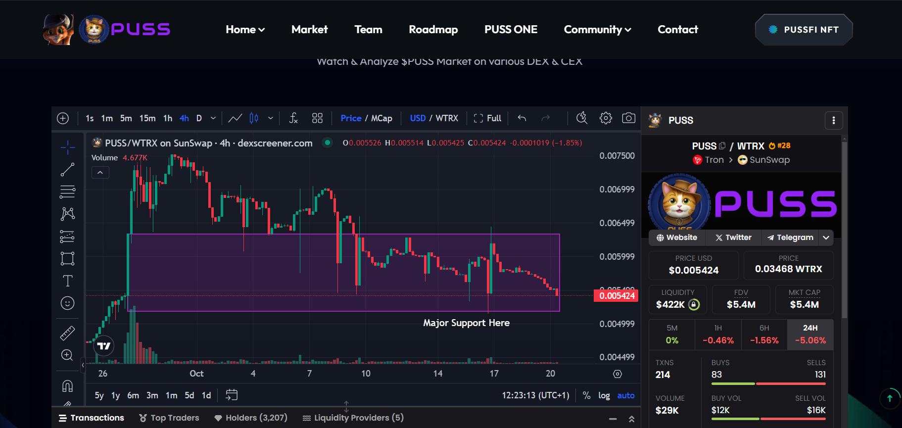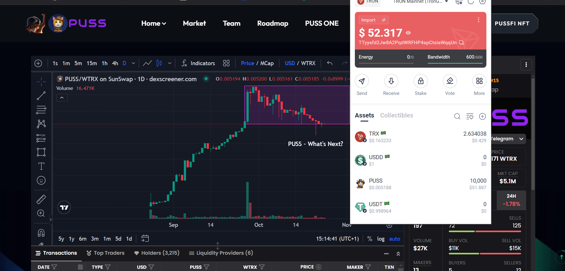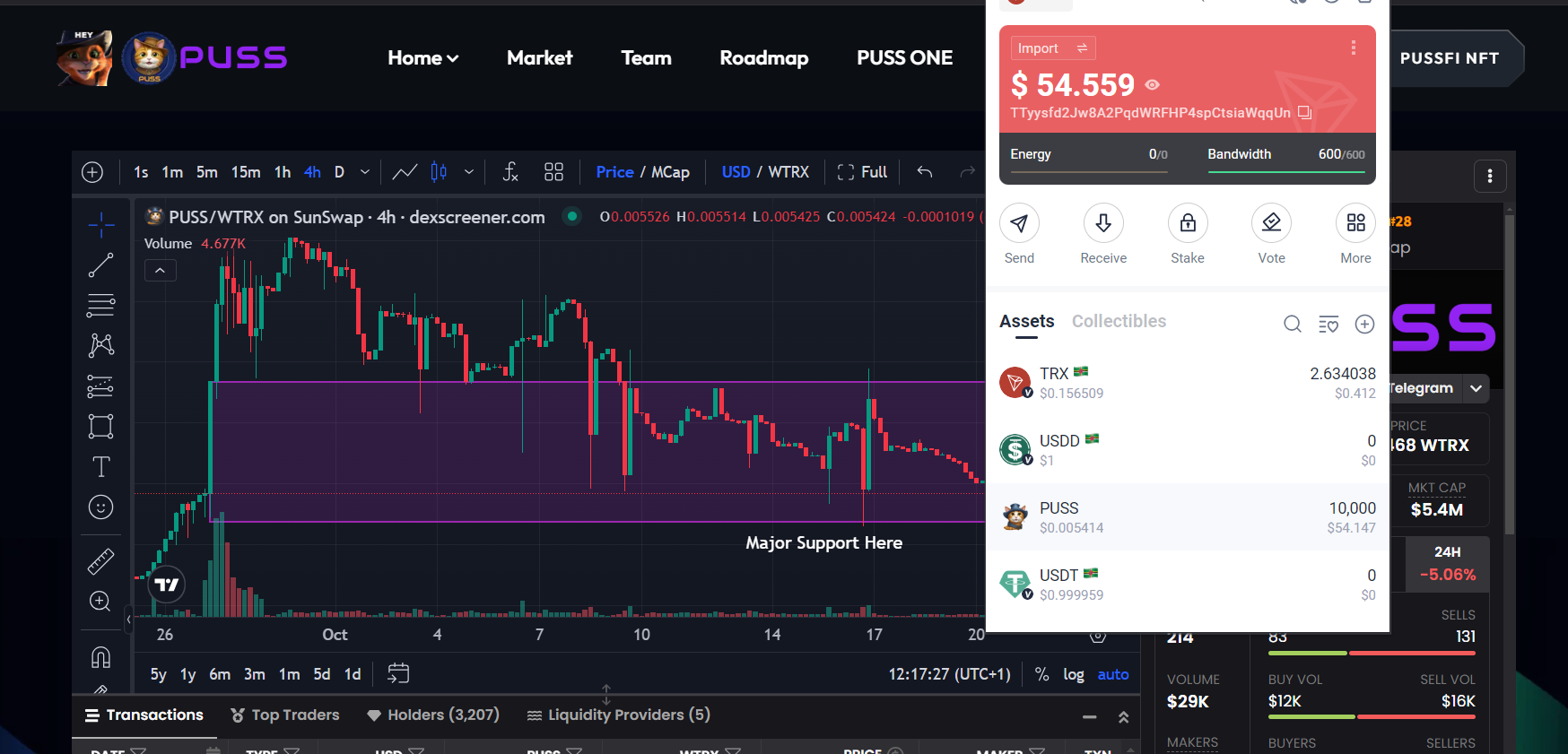 The current price of $PUSS stands at 0.034 TRX; the token's price has decreased by -3.65%. With liquidity of $423.03k and a 24-hour trading volume of 185,985.9 TRX, the market cap has crossed below the $6M breakthrough and is currently at $5.4M in total market capitalization. I believe getting to $10M is still just a matter of time.