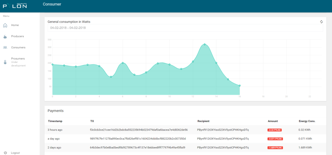 Transactions certifying the information: All the energy data generated from Consumers and Producers is recorded on the blockchain in the most transparent (and most secure) possible way. The consumption and production graphs allow you to check the recorded energy data from today and yesterday by retrieving the information directly from PylonCoin blockchain.