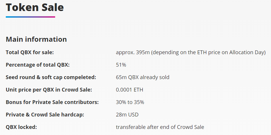 The coin of QBX is compatible to ERC20 and is constructed on the Ethereum Blockchain block. Qiibee makes all efforts to finish both design of tokens, and economy. This document contains no information on dates of the ICO company from the moment of writing of this article. You can often check the website for existence of updates.