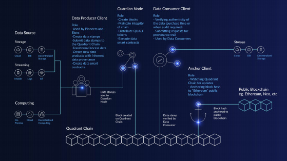 The Quadrant Protocol is a decentralized information outline. It is ingestion, preparing and capacity rationalist. It is intended to work with both incorporated and decentralized administrations. The design comprises of the center Quadrant blockchain, customers (Data Producer, Data Consumer and Anchor) and Watchman Nodes. Quadrant will work on a Proof of Authority accord system so it can deal with more exchanges, work at a lower gas cost, accomplish quicker exchanges and limit malevolent hubs from entering information into the system. An outer Proof of Work chain will be utilized as a grapple for security purposes. For now, the Ethereum blockchain will be utilized for tying down however it can be supplanted by any open chain later on if necessary.