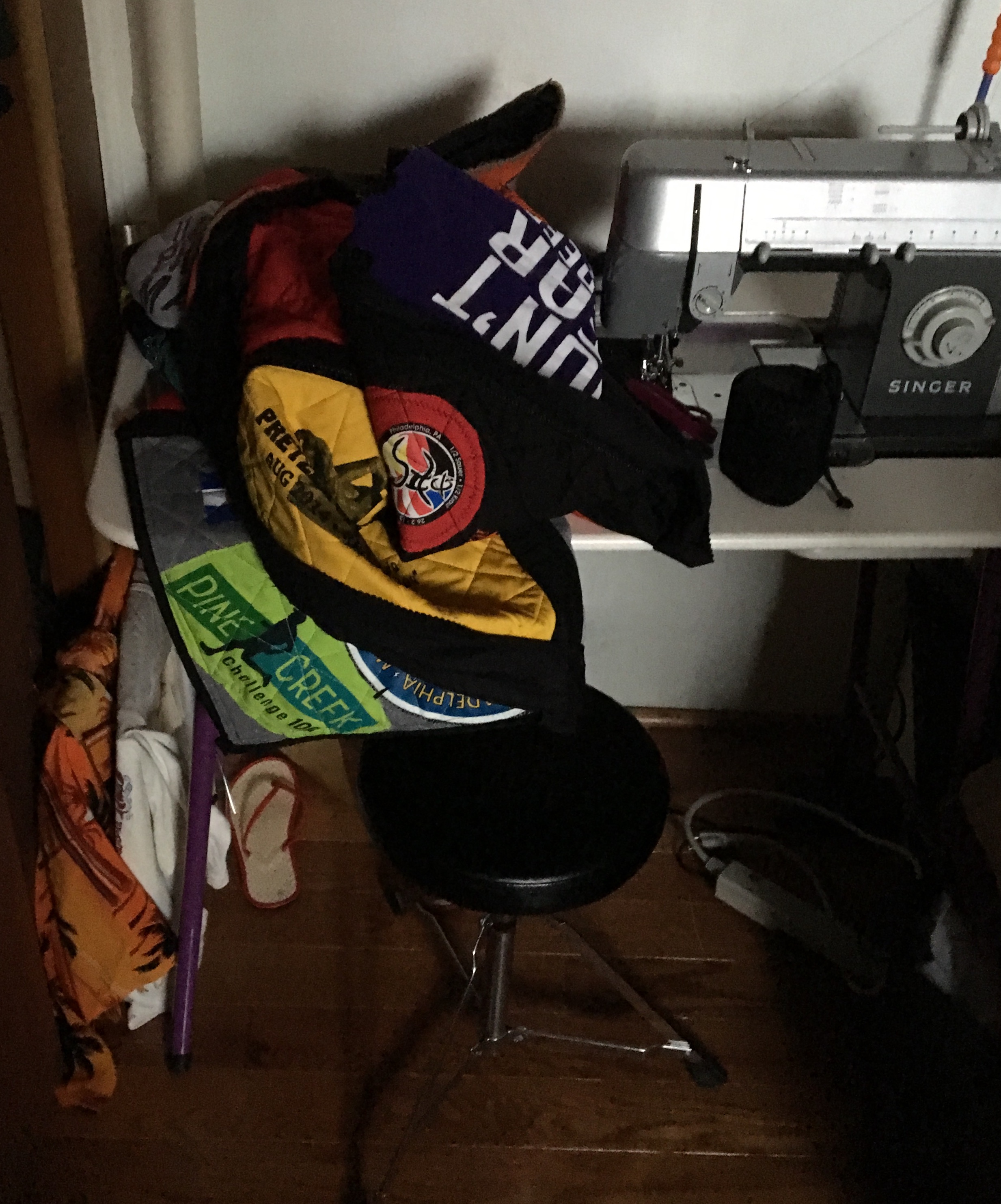 This is just FAB! What an awesome idea and place to put t-shirts! Were these shirts old ones that you just hung onto? So I see that you commented there is a shirt on the front and the back of the quilt. Did you fold them back to back and place the batting in between them? This is so interesting and I would love to hear how you placed them! It looks really awesome! I also love the black outlining you added!