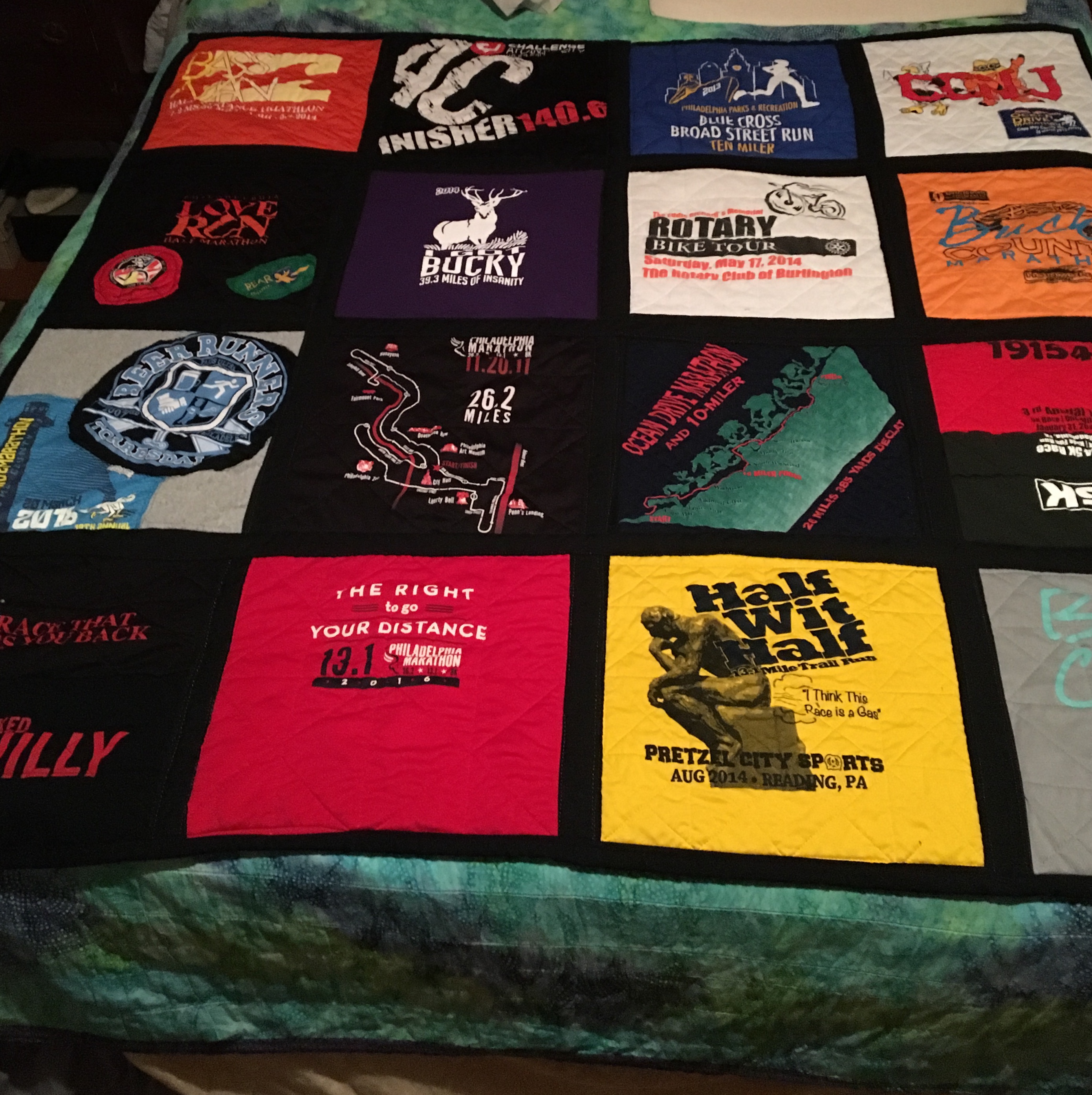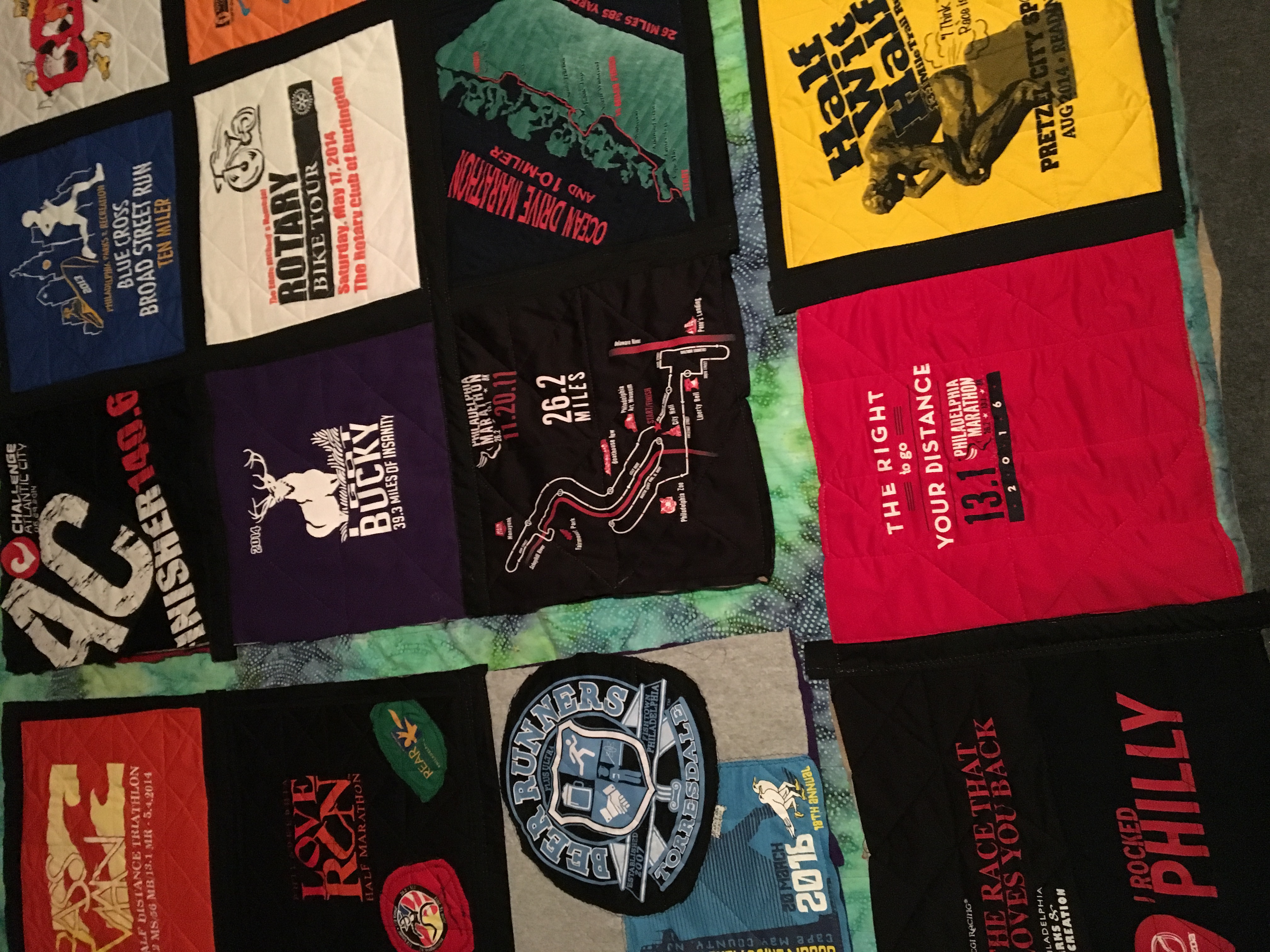 These shirts are a friends accomplishments over the years, i was commissioned for the quilt. I cut all the shirts, used fusible web for the mesh fabrics and used batting or fleece blankets inside the sandwich, then quilted each block. It was fun to build thanks @crosheille 🌸