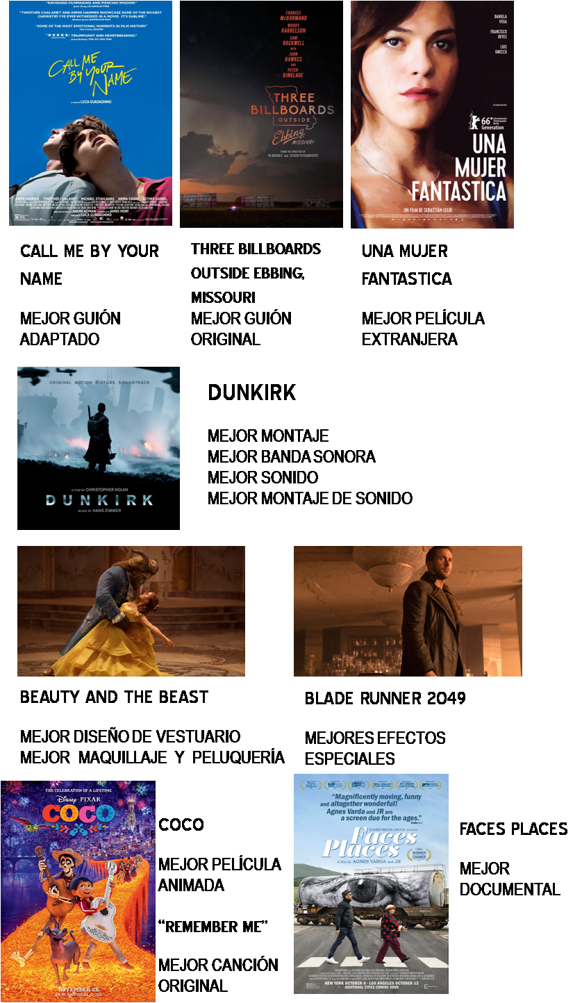 Hola! Ya revise y las que pusiste están bien. Estas son las que faltan: Mejor Actor de Reparto: Willem Dafoe, Mejor Actriz de Reparto Allison Janney, Mejor Película Animada: Coco, Mejor Canción Original: Remember Me, Mejor Película Documental: Faces Places, Mejores Efectos Especiales: Blade Runner 2049 y Mejor Maquillaje: Beauty and the Beast.