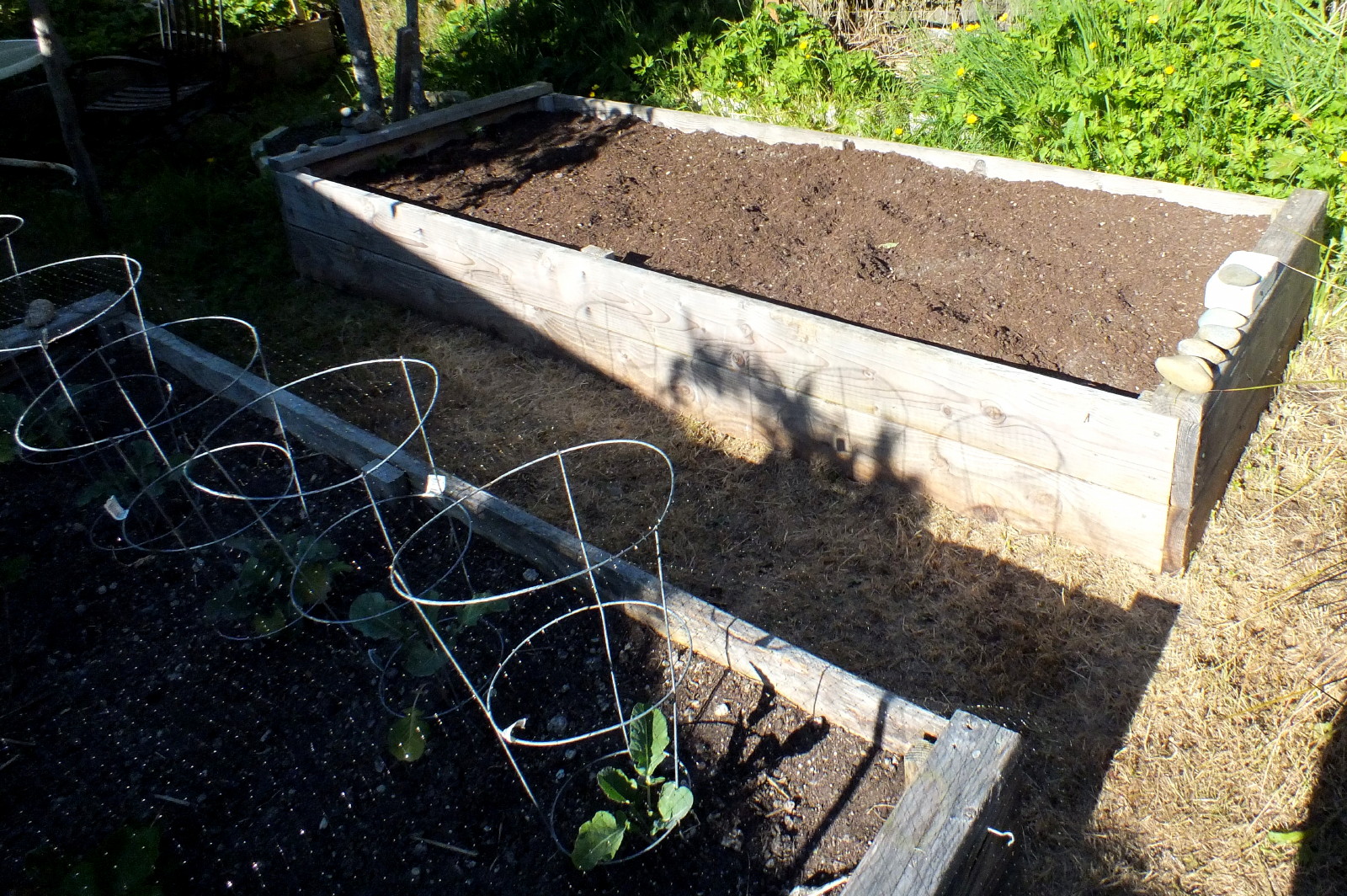 Managed to get most of our raised beds weeded and clean, and ready for new planting. In the foreground (above) we've got some broccoli plants getting started. Having tomato cages around broccoli actually makes sense, as it helps keep the plant upright and healthy in our frequently strong winds.