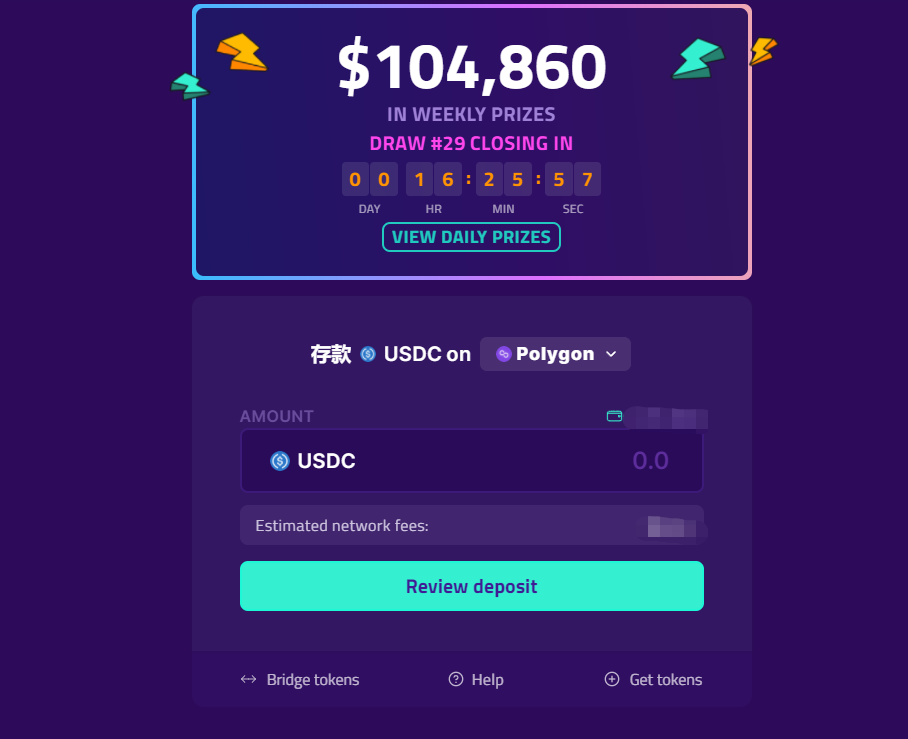 五、PoolTogether是需要存一些usdt,按照任务指示打开链接https://v4.pooltogether.com/deposit 后,存入小额usdc即可,注意不要选择以太链上的。再等几分钟,赎回任务,等级提升。