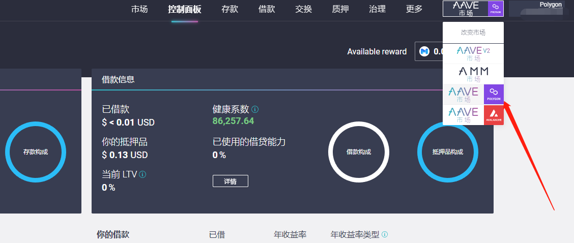 按照任务提示链接,进入aave市场https://app.aave.com/#/dashboard后,要选择matic市场