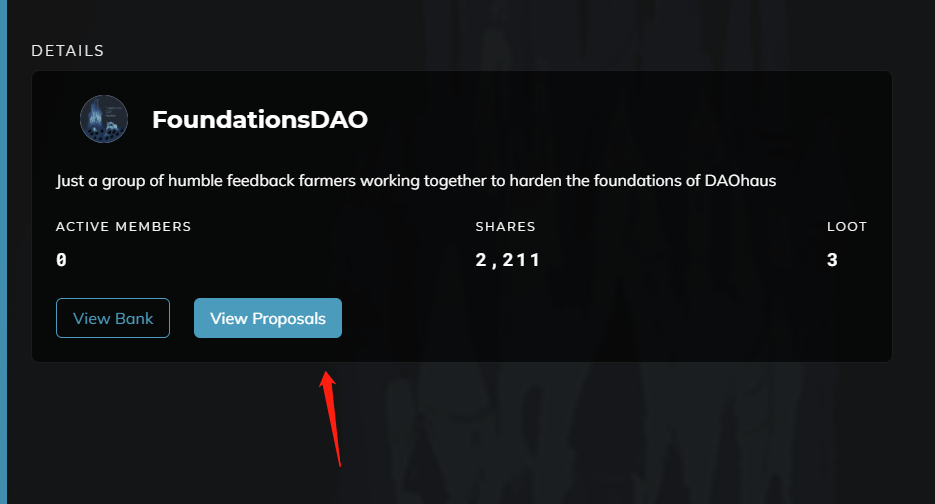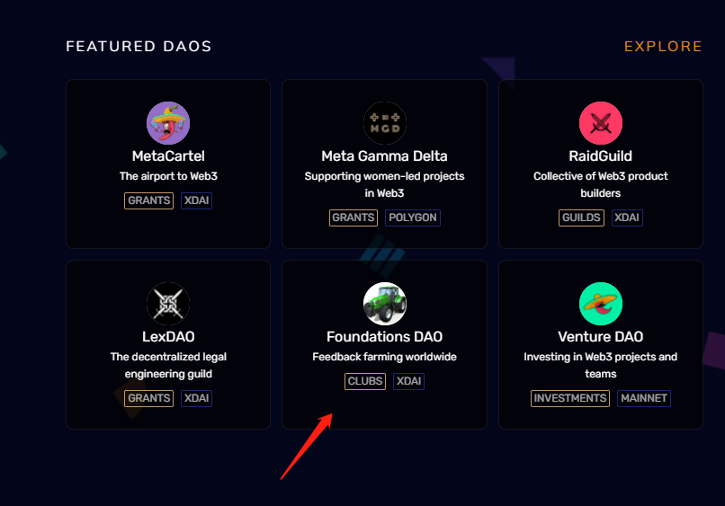 八、DAOhaus任务总计有4个任务,如果都想完成,那么至少需要一个haus,这个币单价约20刀,但好在是xdai链上的项目,gas费用不高。这个任务全做的话,20元就不够了,不适合矩阵用户(如果想做,单独出教程)。只有第三个子任务Create another proposal in FoundationsDAO适合我们。点击任务链接打开https://app.daohaus.club,然后在右侧选择FoundationsDAO。
