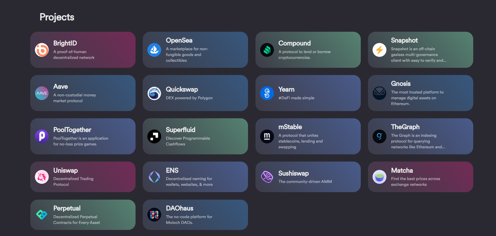 主要做BrightID、Snapshot、Aave、Quickswap、PoolTogether、Superfluid、Sushiswap和DAOhaus这个几个项目。