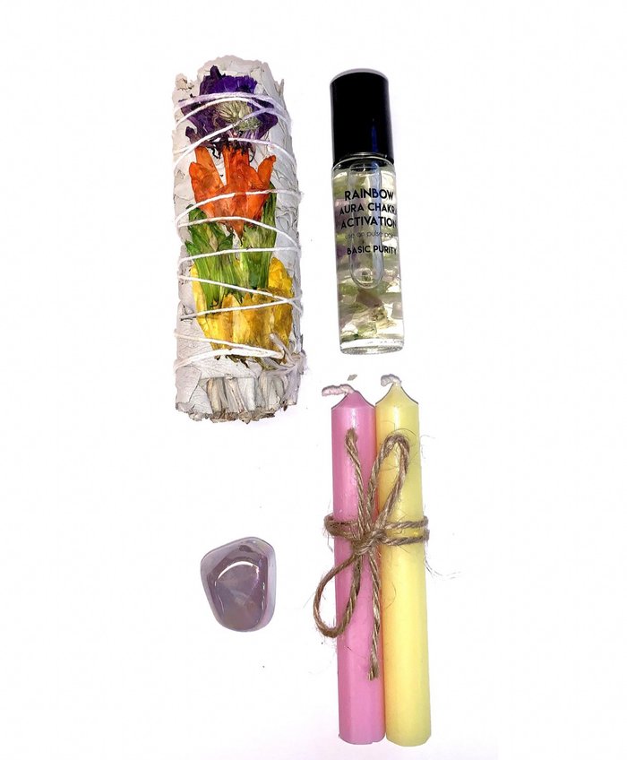 Aura Activation Roll-on, Amethyst Aura Rainbow Crystal, Candles, Sage Bundle, and a Activation Visualization Meditation.