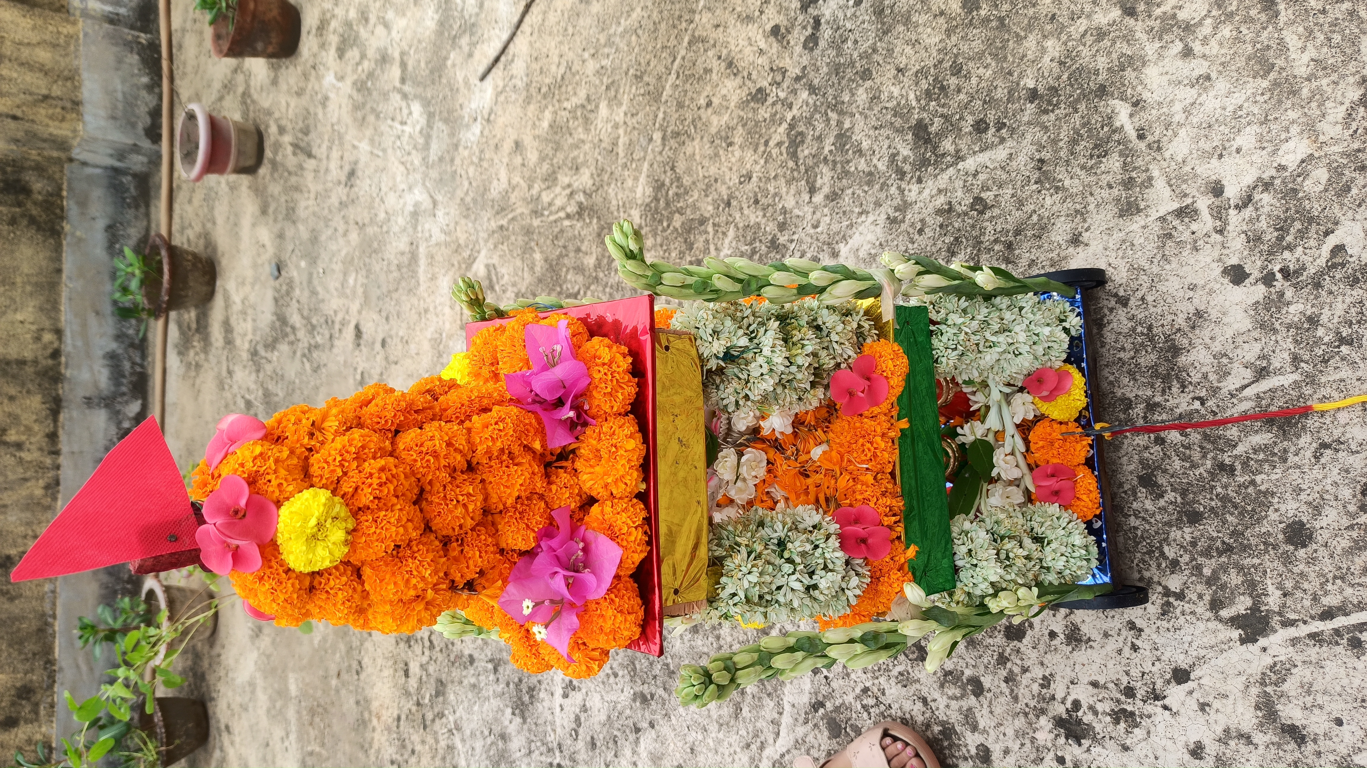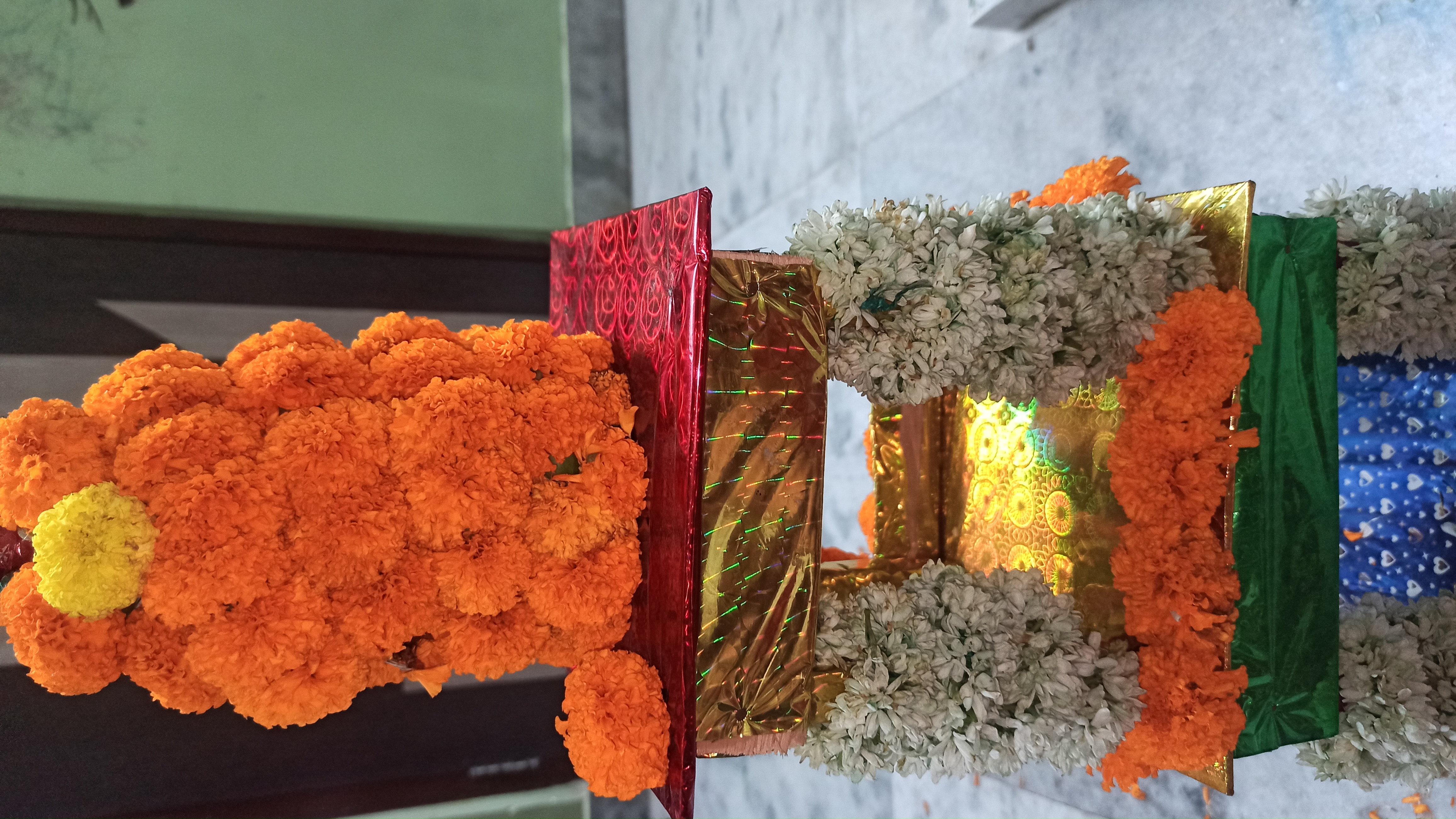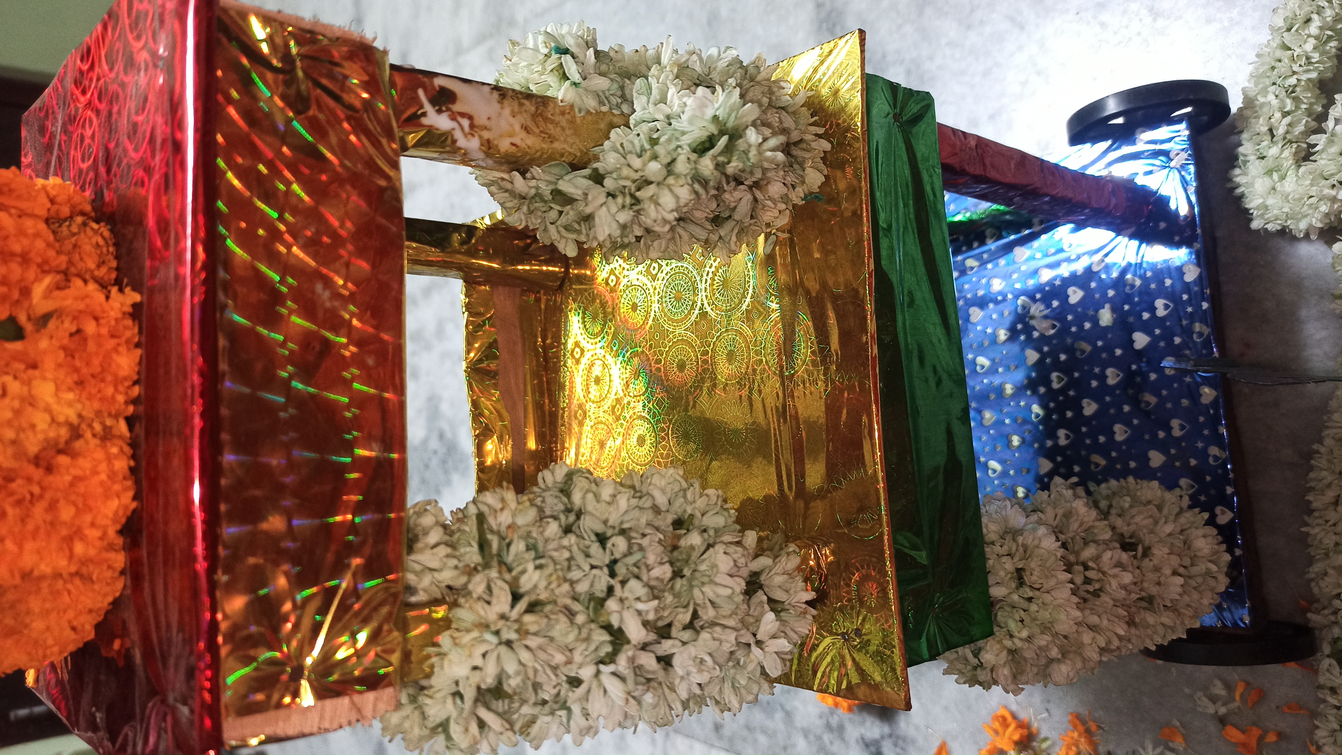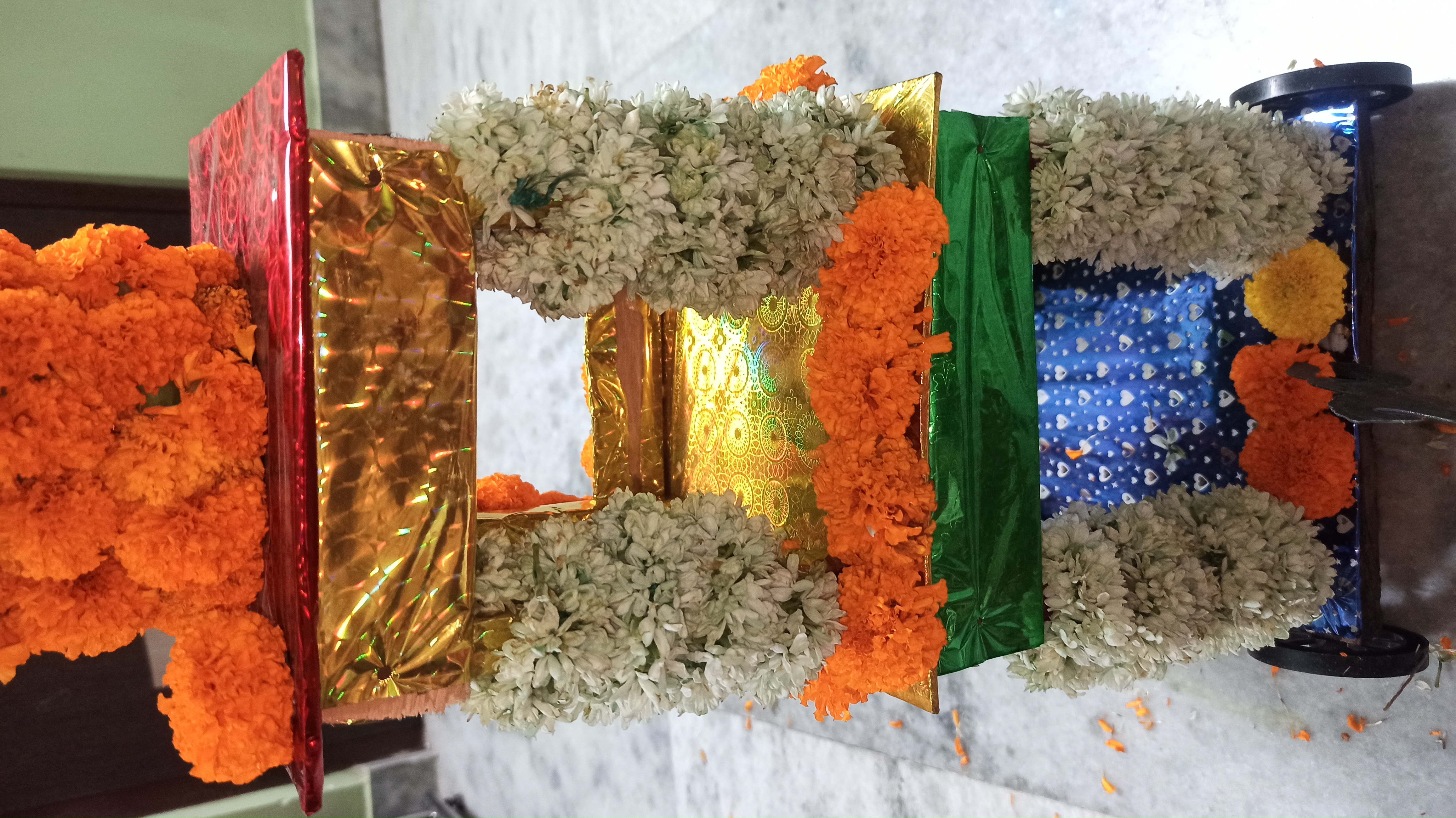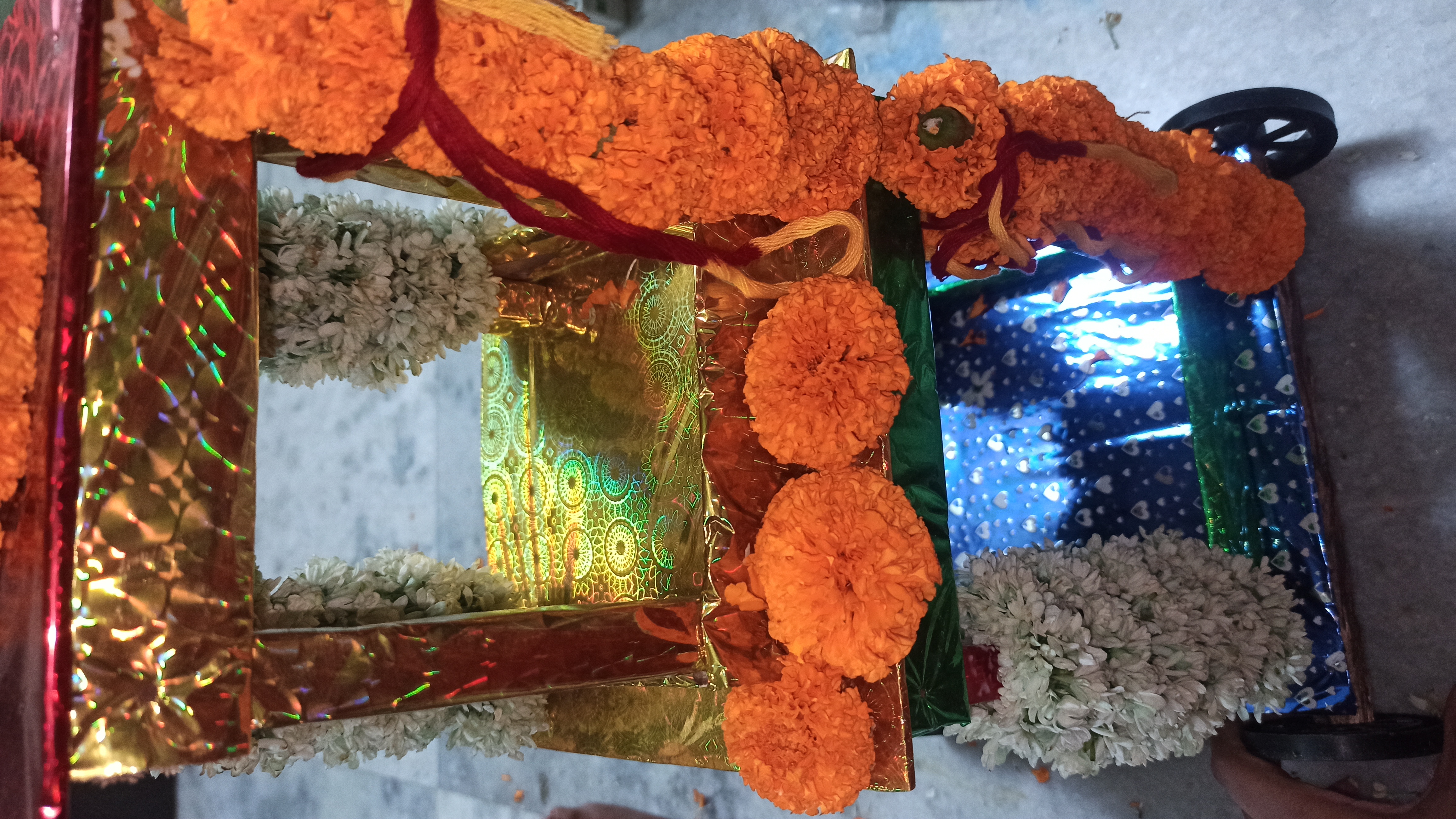 গতকাল রাতে একটা বাজার থেকে একটা রথ কিনে এনেছিলো টিনটিন বাবুর জন্য।তাই ভাবলাম রথটিকে একটু সাজিয়ে দেই। আসলে আমি আগে কোনদিন রথ সাজায়নি। তাই ভাবলাম এবার সাজানো যাক। তাই বাজার থেকে কিছু গাধা ফুলের মালা জুঁই ফুলের মালা ও কিছু গাধা ফুল এনে নিলাম।