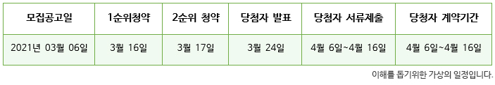 청약일정에 대한 모집공고가 청약홈페이지에 뜨고 나면 약 10여일 뒤 1순위 청약부터 지원받습니다. 1순위 청약에서 미달분이 나올 경우 (공급세대수 > 청약지원수 일 때) 2순위 청약에게도 기회가 돌아갑니다. 당첨자 발표일은 보통 청약접수 완료 후 1주일뒤 발표가 나며, 당첨자 서류제출 기간에 제출해야하 서류에는 등이 포함됩니다. 서류제출 후 특별한 문제가 없을 경우, 당첨자 계약기간동안 당첨자와 시공사간의 계약일정이 뒤따릅니다.