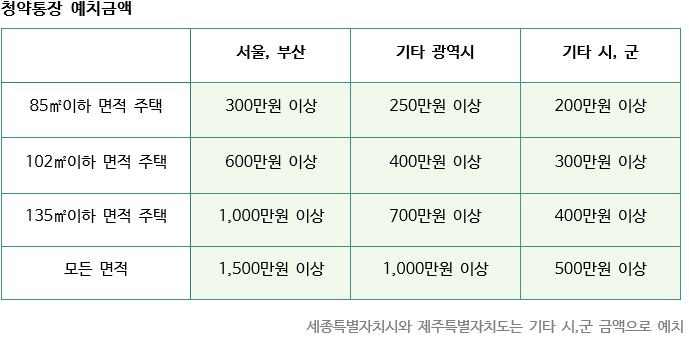 나의 등본상의 주소지 기준 주거지와 지원하는 평형대에 따른 예치금이 다릅니다. 아래의 청약통장 예치금액표를 확인하여 나의 거주지와 지원하는 평형대에 따른 예치금 충족 요건과 함께 기타 여러가지 1순위 조건을 갖추고 나면 1순위 청약지원에 할 수 있습니다.