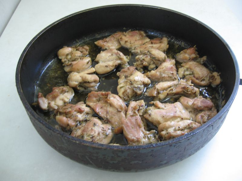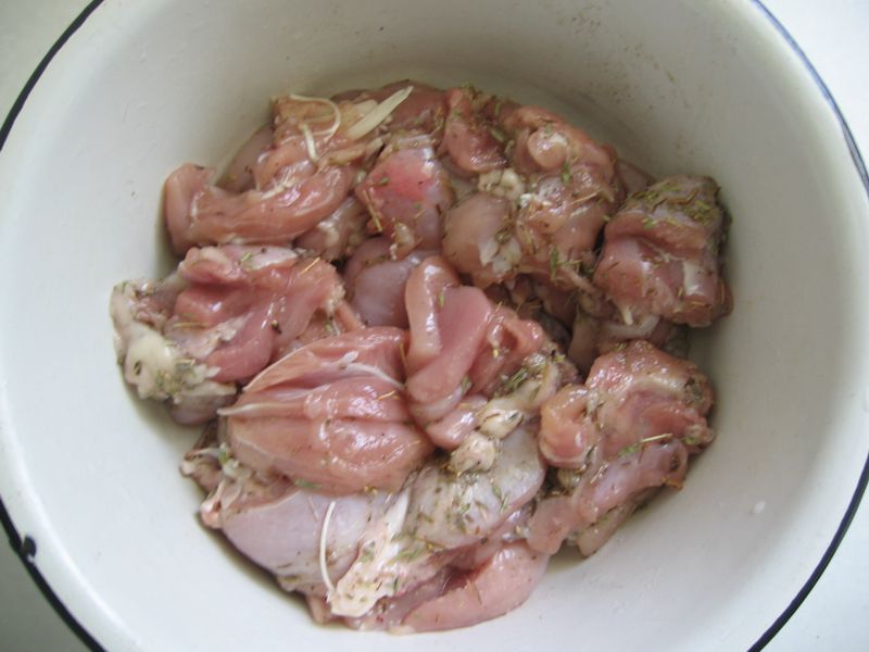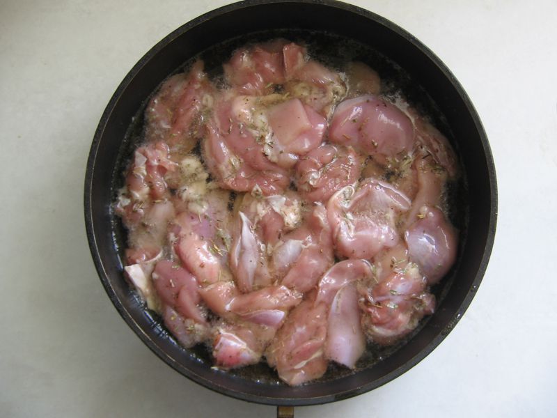 У меня не было ни филе, ни куриной грудки, поэтому пришлось обойтись окорочками (они были уже без костей). Получилось суховато, но тоже достаточно вкусно. Нарезаем мясо на кусочки размером примерно со спичечный коробок. Солим, перчим, добавляем по вкусу специи. Сегодня у меня был тимьян. Хорошенько всё перемешиваем.
