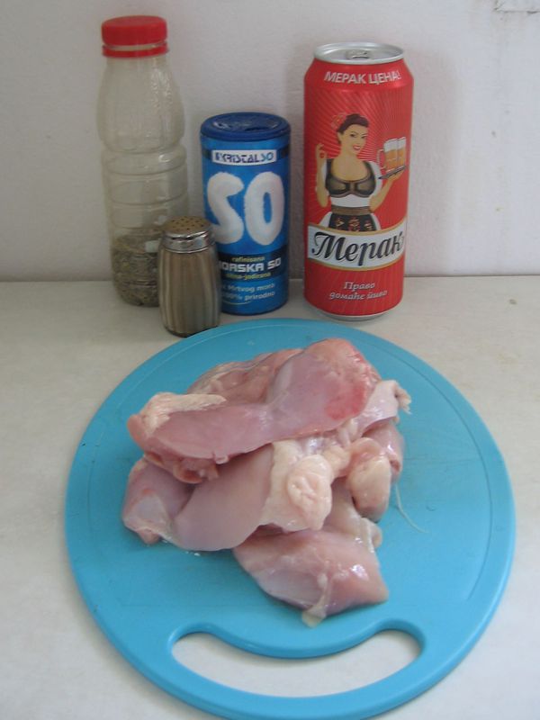 Једном, кад сам била мала, мајка је спремила дивно јело: пиле у пиву. Ово је било цело пиле смештено на плех и печено у пивском преливу. Са дивним корицом и пријатним укусом. Памтим да је мајка повремено вадила пиленце из рерне, где оно је било отприлике сат времена, и преливала горе пивом са плеха. Било је укусно! Али сада пећи цело пиле за двоје није удобно. Зато правим једноставнију варијанту. Ово је мање укусно, без хрскаве корице, али исто вреди да пробате.