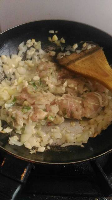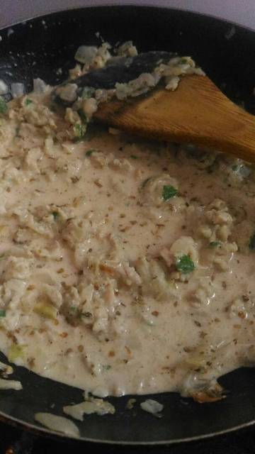 - Heat the oil a little, saute garlic chopped garlic and onion chopped until fragrant, put chicken in the stir well, give the salt 1/2 spoon, little pepper, oregano, nutmeg, black pepper slightly, mix well until ripe ..