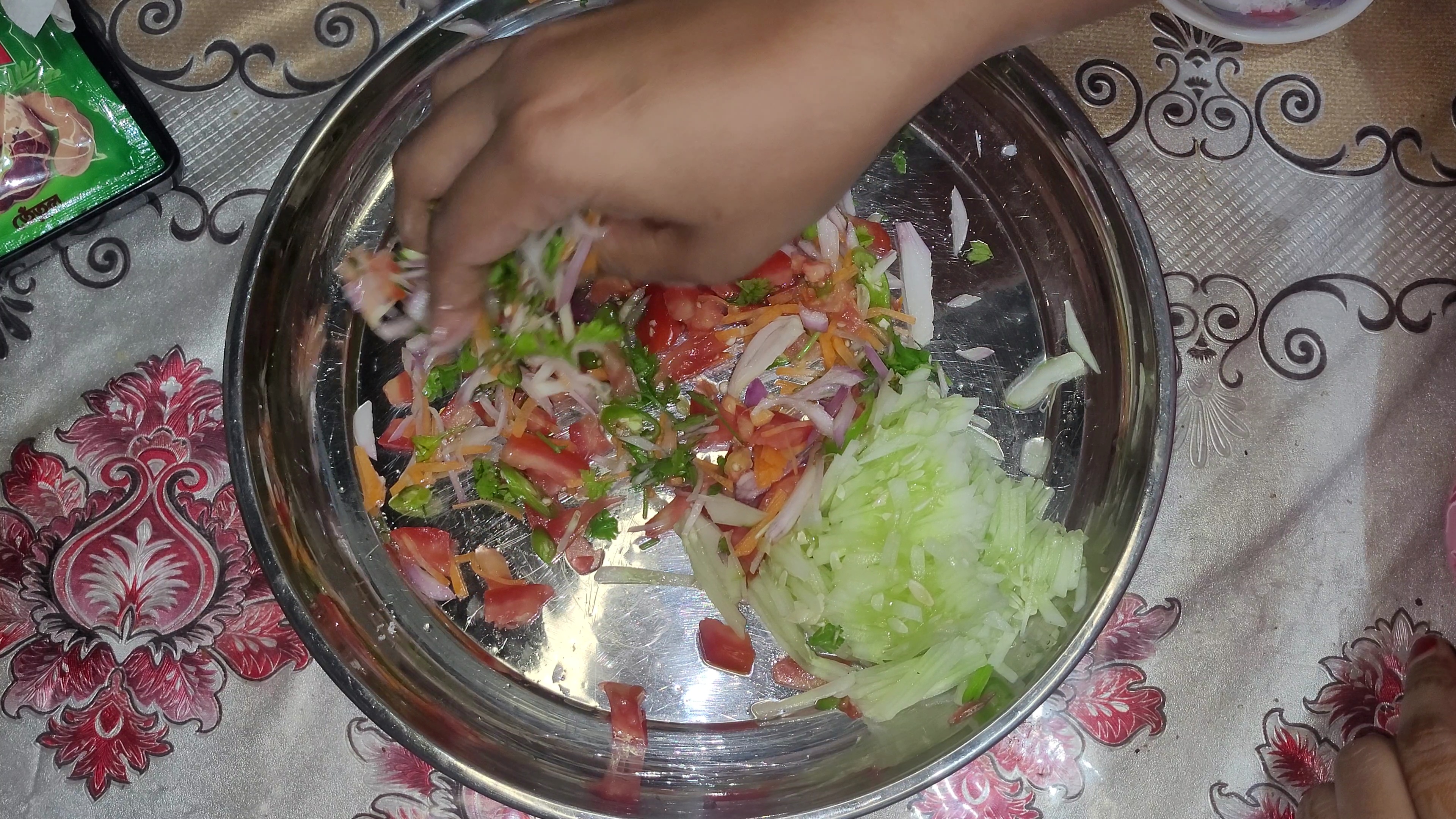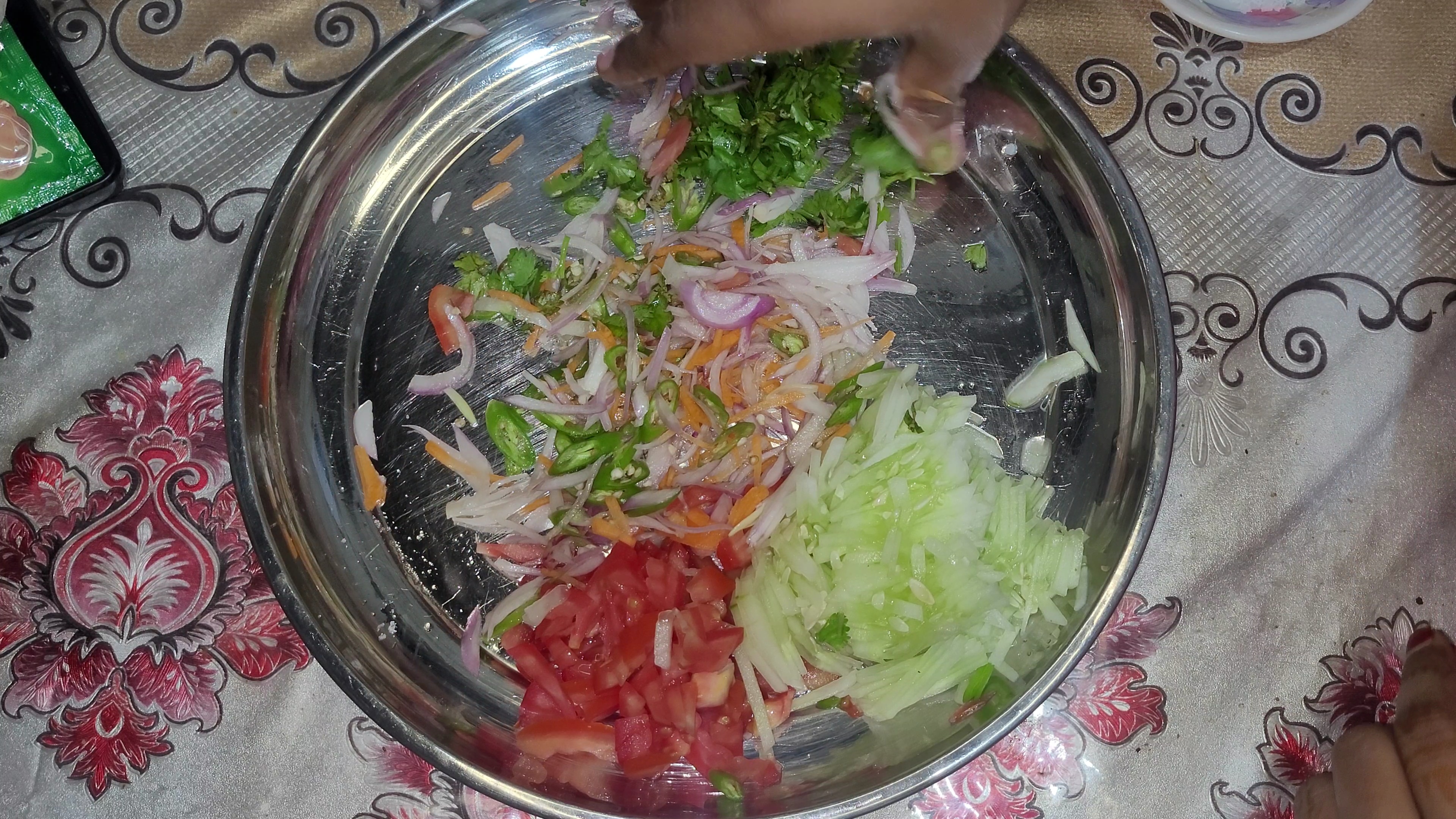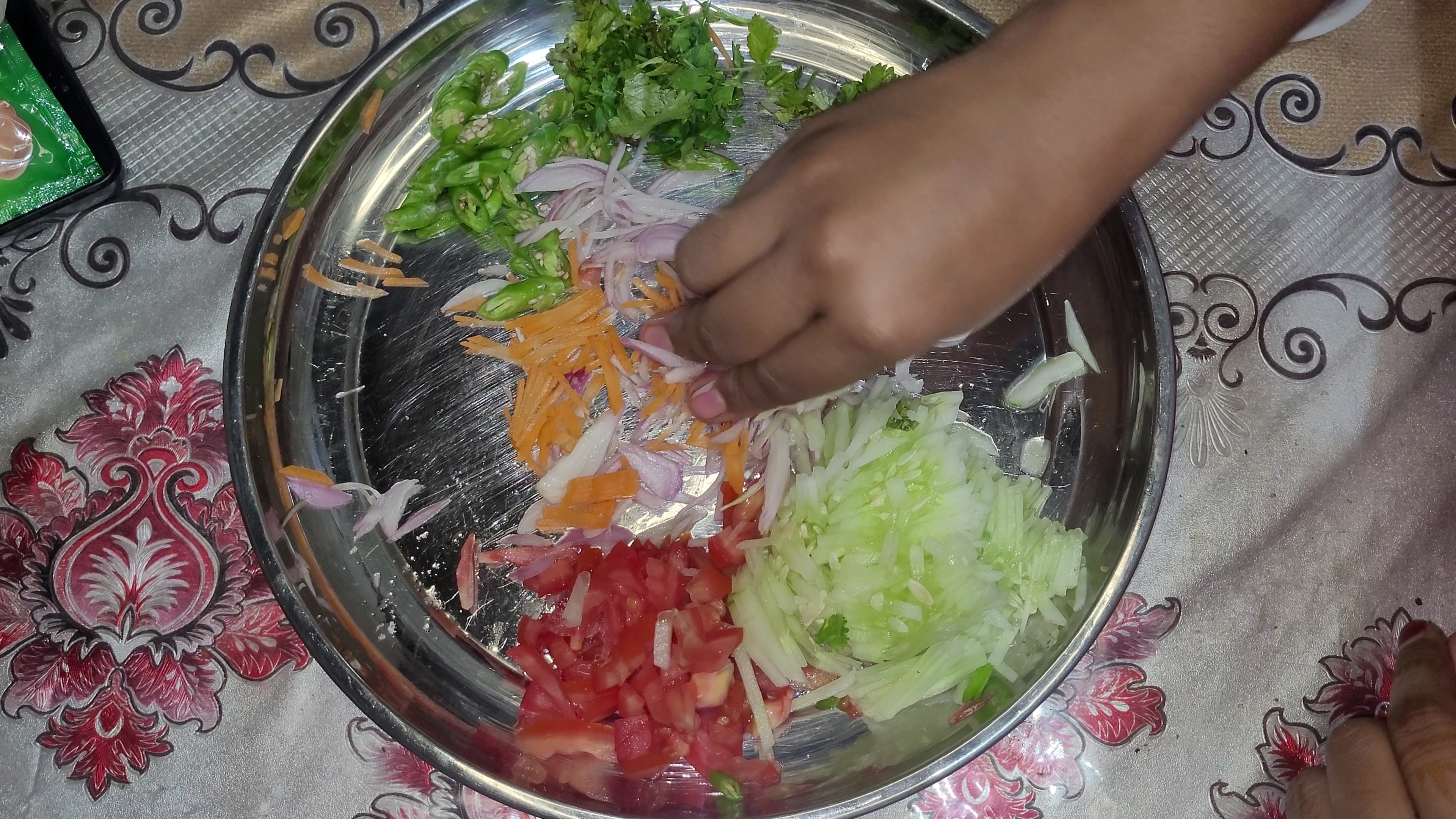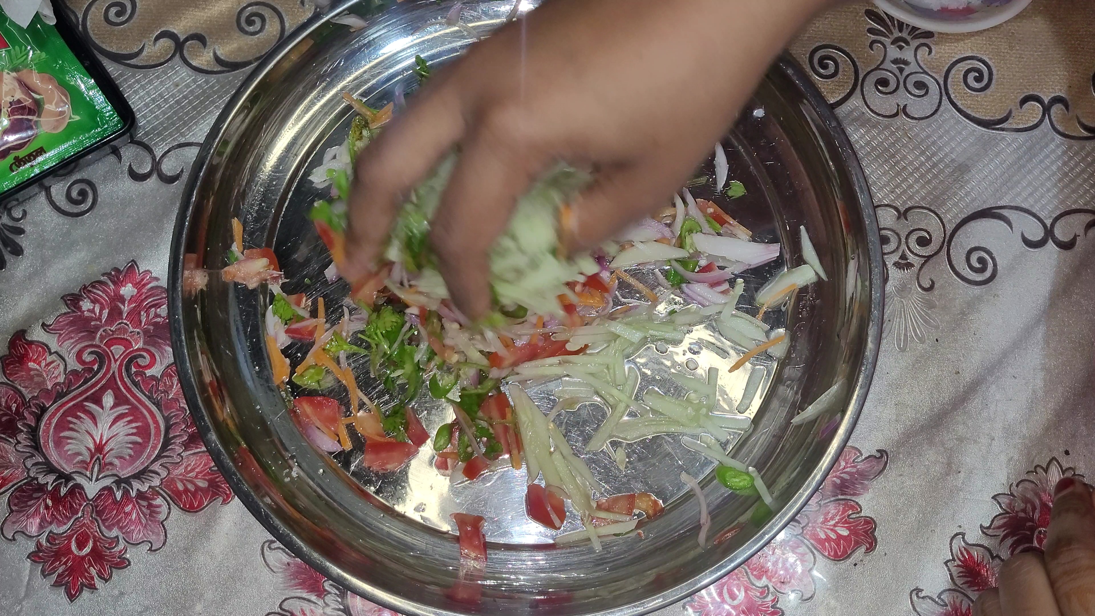 প্রথমেই একটি প্লেটে সব উপকরণ কুচি করে কেটে নিয়ে নিলাম। এরমধ্যে ছিল শসাকুচি,টমেটো কুচি,গাজরকুচি, পেয়াজকুচি,কাচামরিচ কুচি এবং ধনেপাতা কুচি। এখন একটু লবণ দিয়ে পেয়াজ ভালো করে মেখে নিলাম।