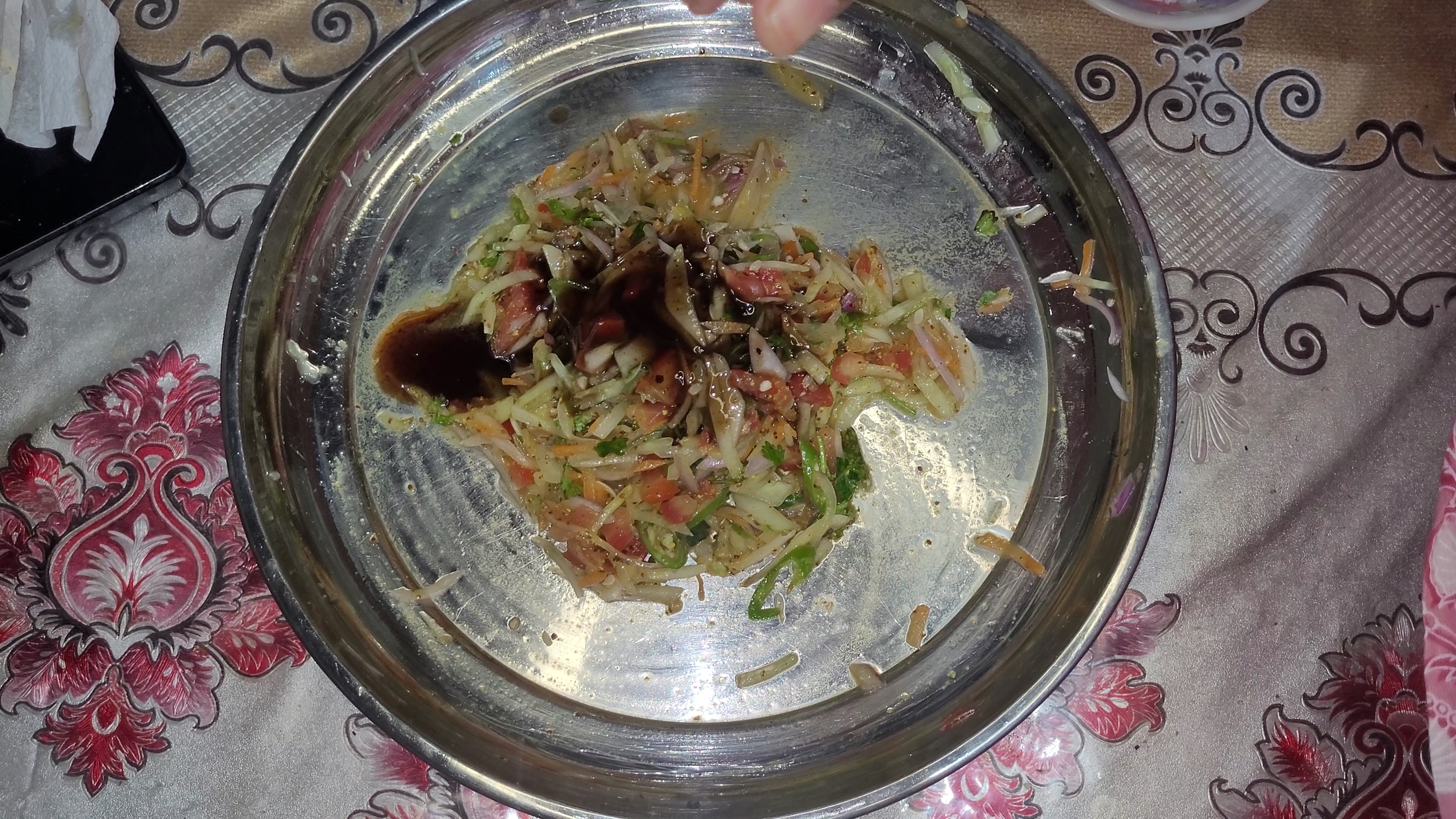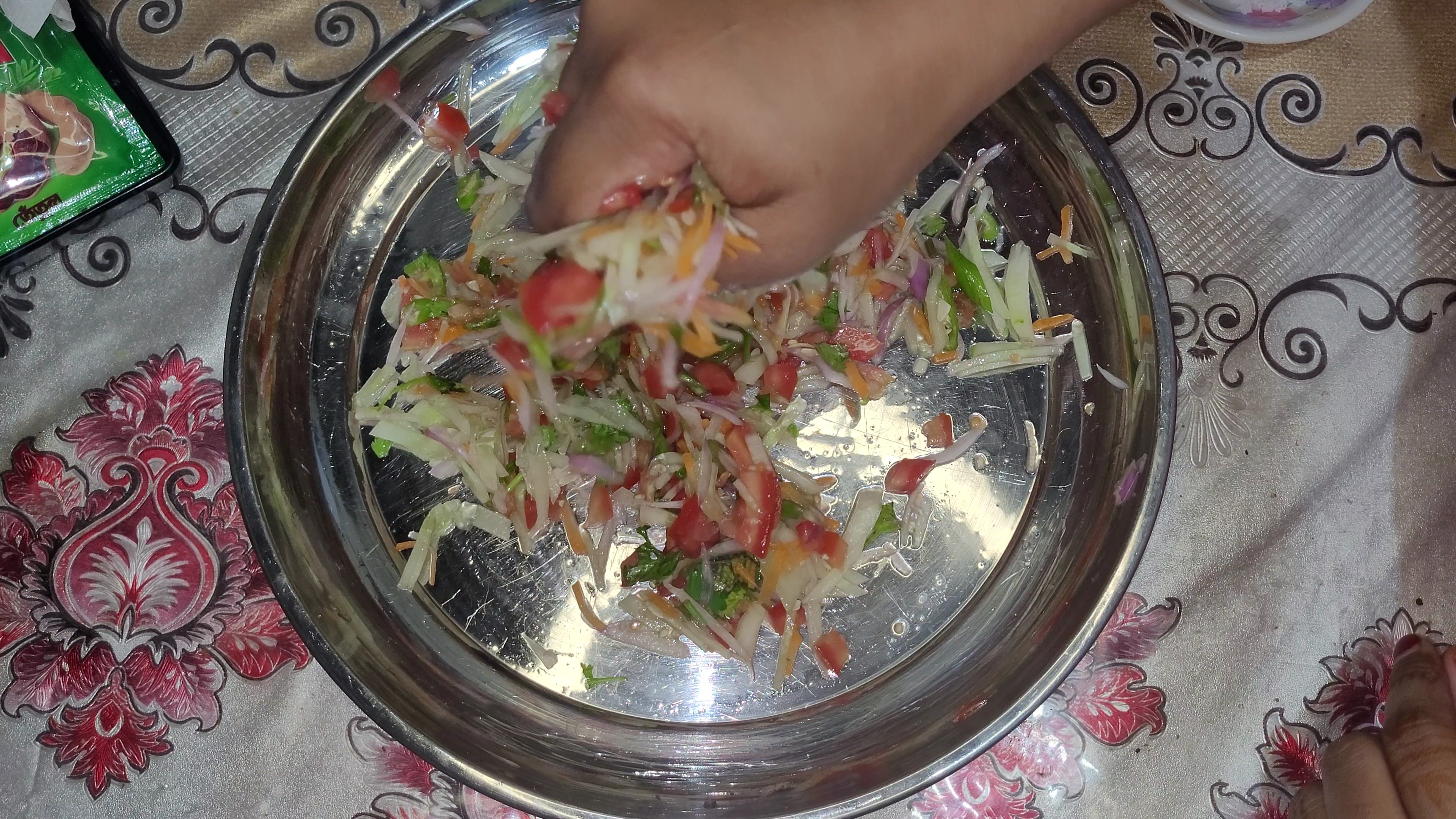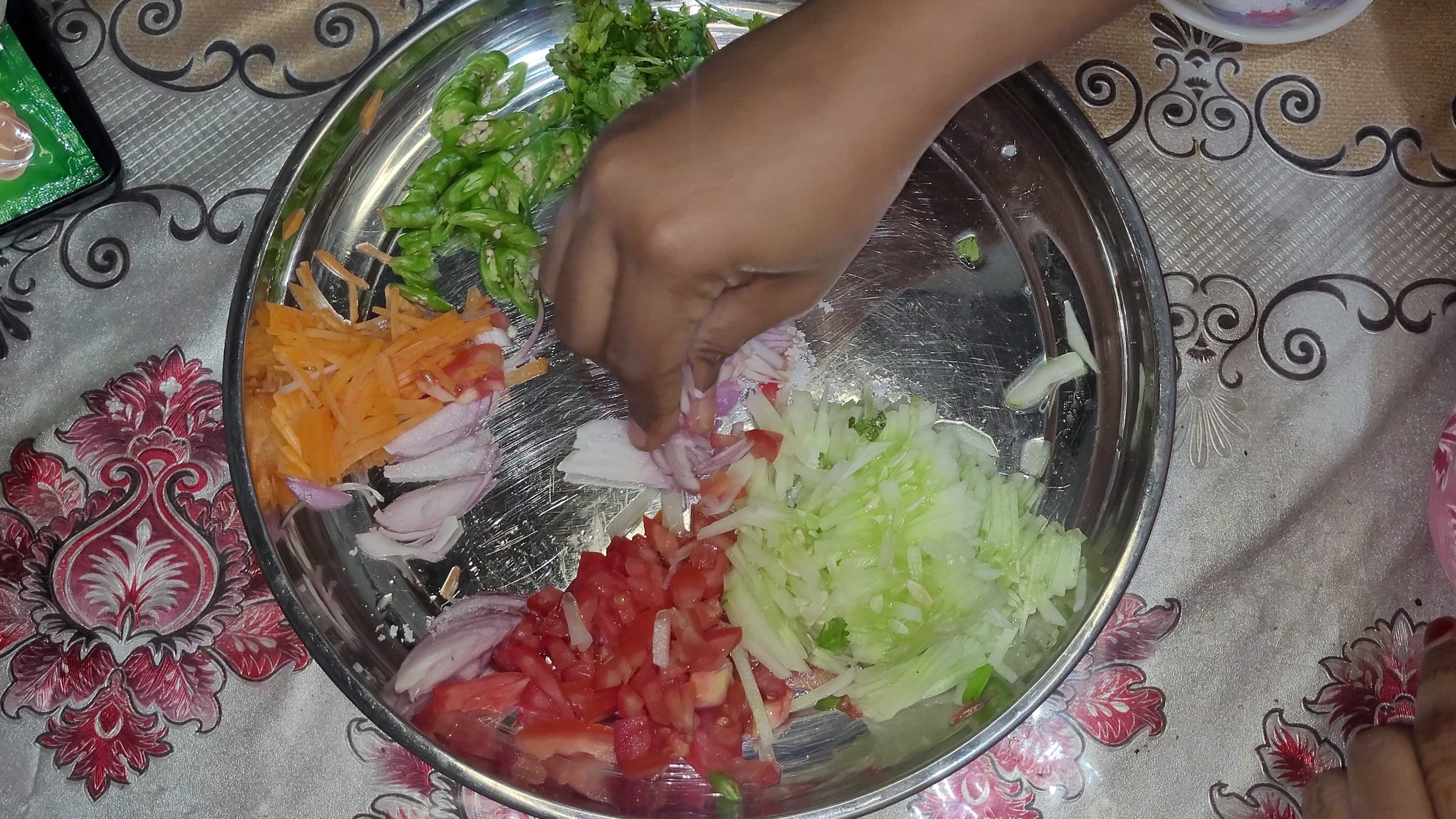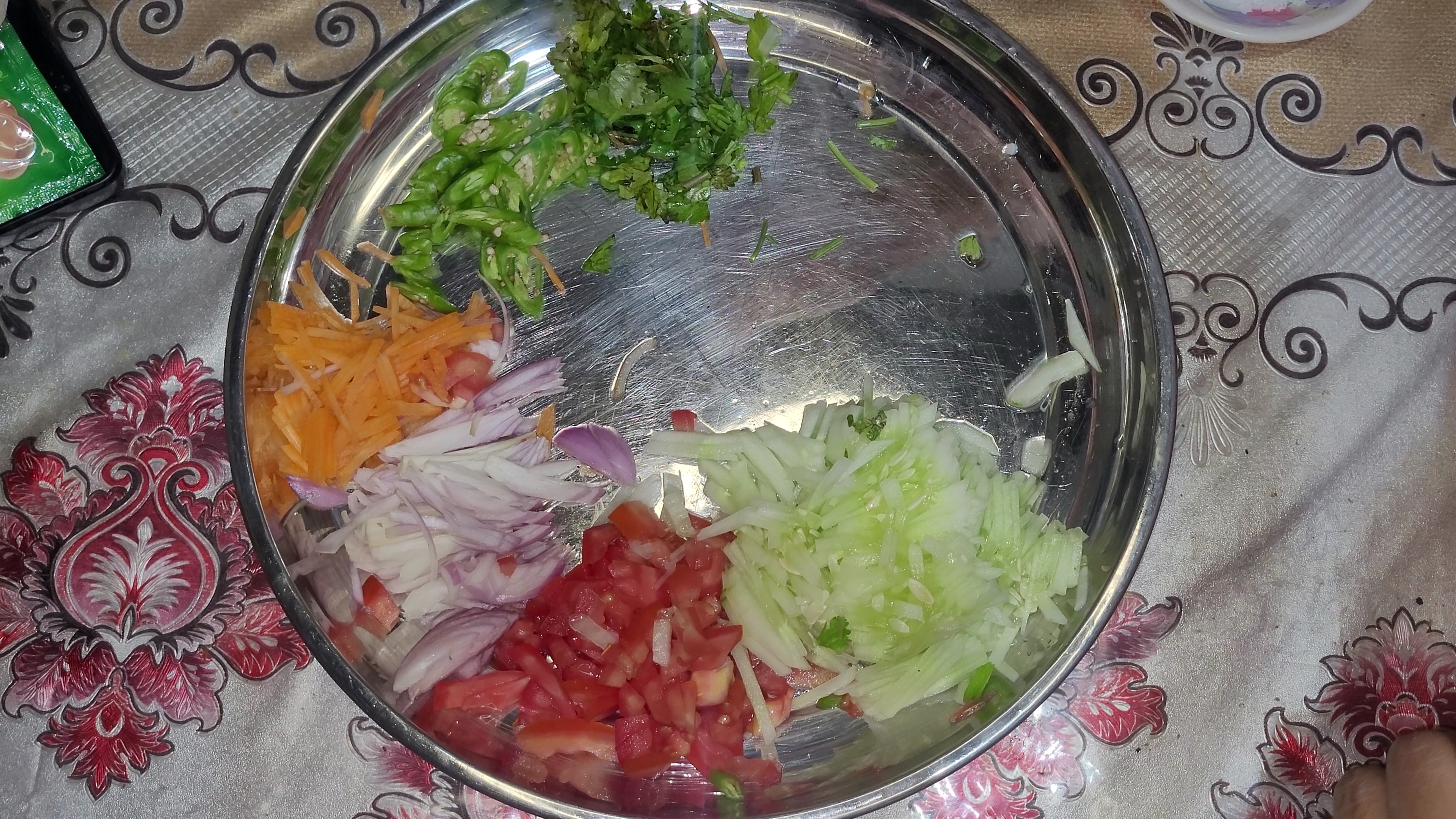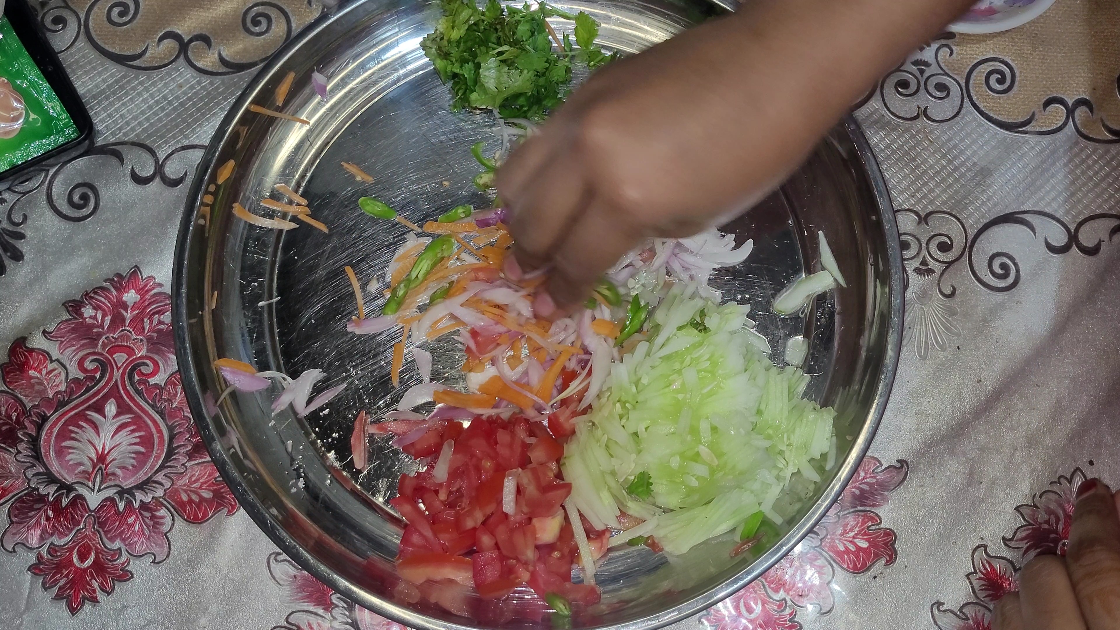 প্রথমেই একটি প্লেটে সব উপকরণ কুচি করে কেটে নিয়ে নিলাম। এরমধ্যে ছিল শসাকুচি,টমেটো কুচি,গাজরকুচি, পেয়াজকুচি,কাচামরিচ কুচি এবং ধনেপাতা কুচি। এখন একটু লবণ দিয়ে পেয়াজ ভালো করে মেখে নিলাম।