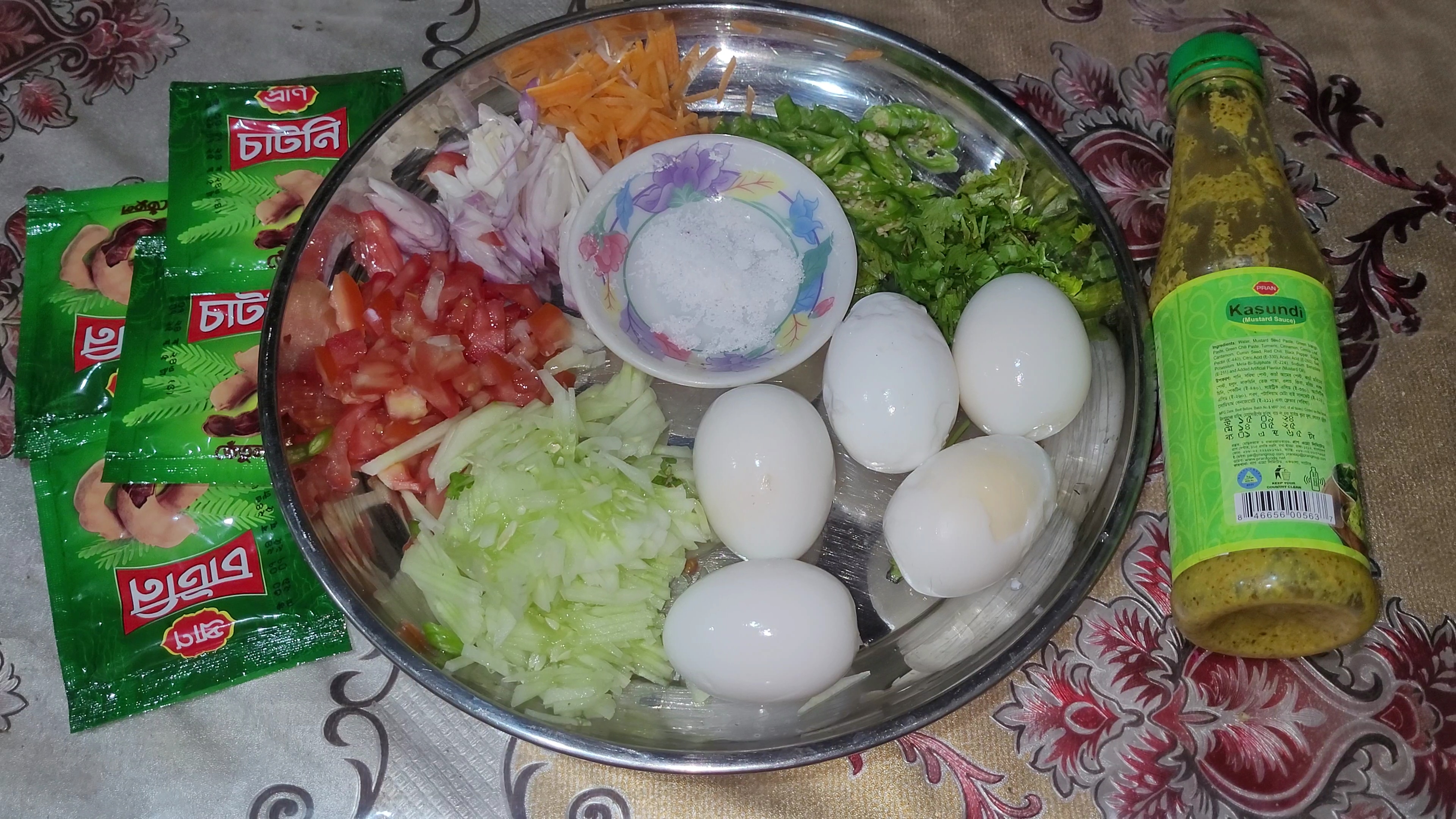 বিভিন্ন উপকরণ দিয়ে যে সালাদ মিস করেছি এটা খেতে এত মজা হয়েছিল যে এমনিতেই এটা খেতে কাড়াকাড়ি লেগে গিয়েছিল। এটা অনেক আগে থেকেই একটা ভাইরাল রেসিপি যেটা ভিডিও কিংবা ছবি সব সময় চোখের সামনে ভাসতো। যাই হোক আমি আমাদের পরিবারের সবার জন্য একটি করে ডিম দিয়েছিলাম আর এই ডিমের চাটের রেসিপিটা তৈরি করেছিলাম। খুব সহজে কিন্তু এটা তৈরি করা যায়। তবে একটু বেশি উপকরণ প্রয়োজন হয়। তবে যত বেশি উপকরণ দেয়া যায় তত বেশি মজা লাগে। যাইহোক কথা আর না বাড়িয়ে রেসিপিটা তৈরি করি।