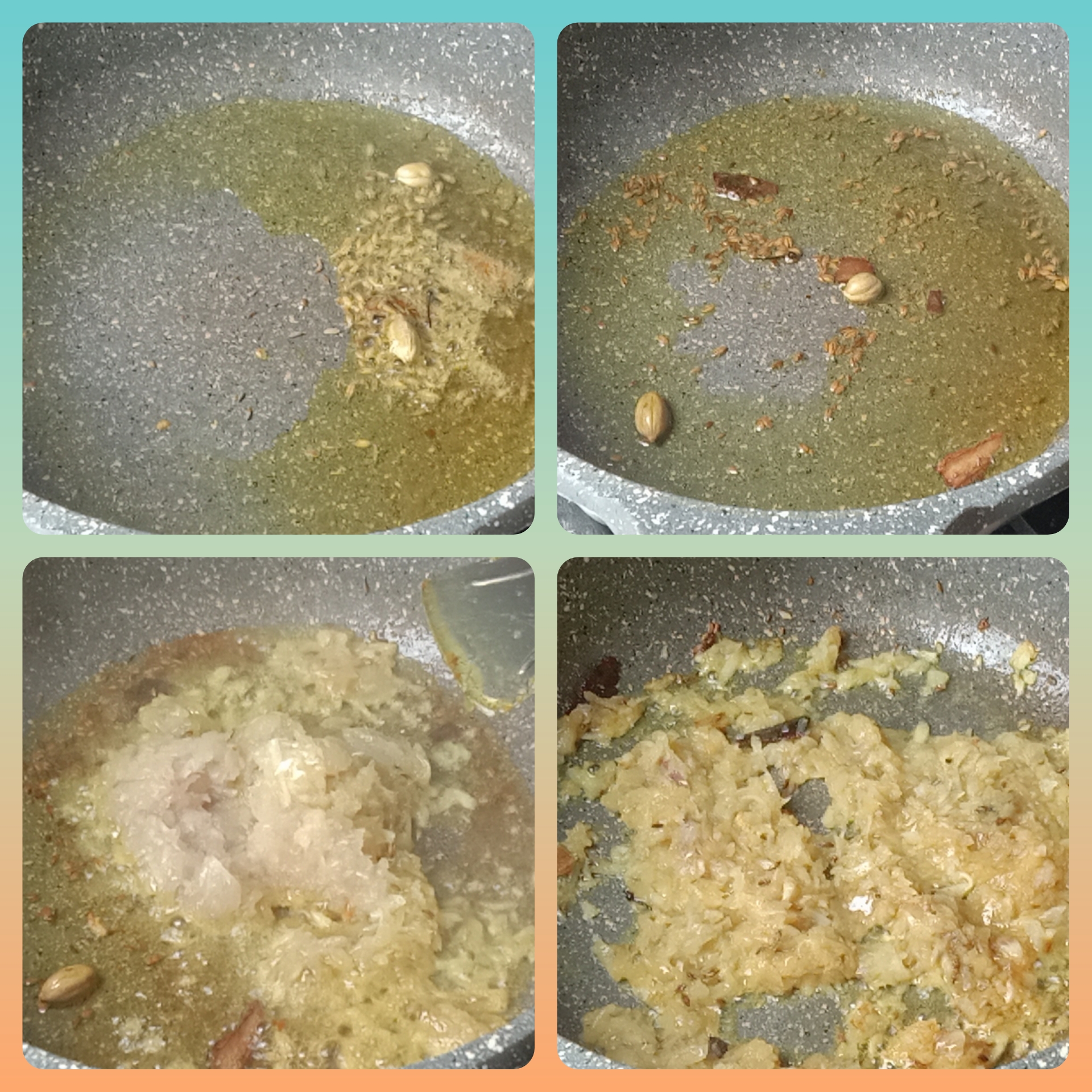 মাছ ভাজার তেলের মধ্যে গোটা জিরা গরম মসলা ফোঁড়ন দিলাম। পেঁয়াজবাটা গুলো ছেড়ে দিলাম। তারপর একটু নেড়েচেড়ে পেঁয়াজগুলো ভেজে নিলাম।