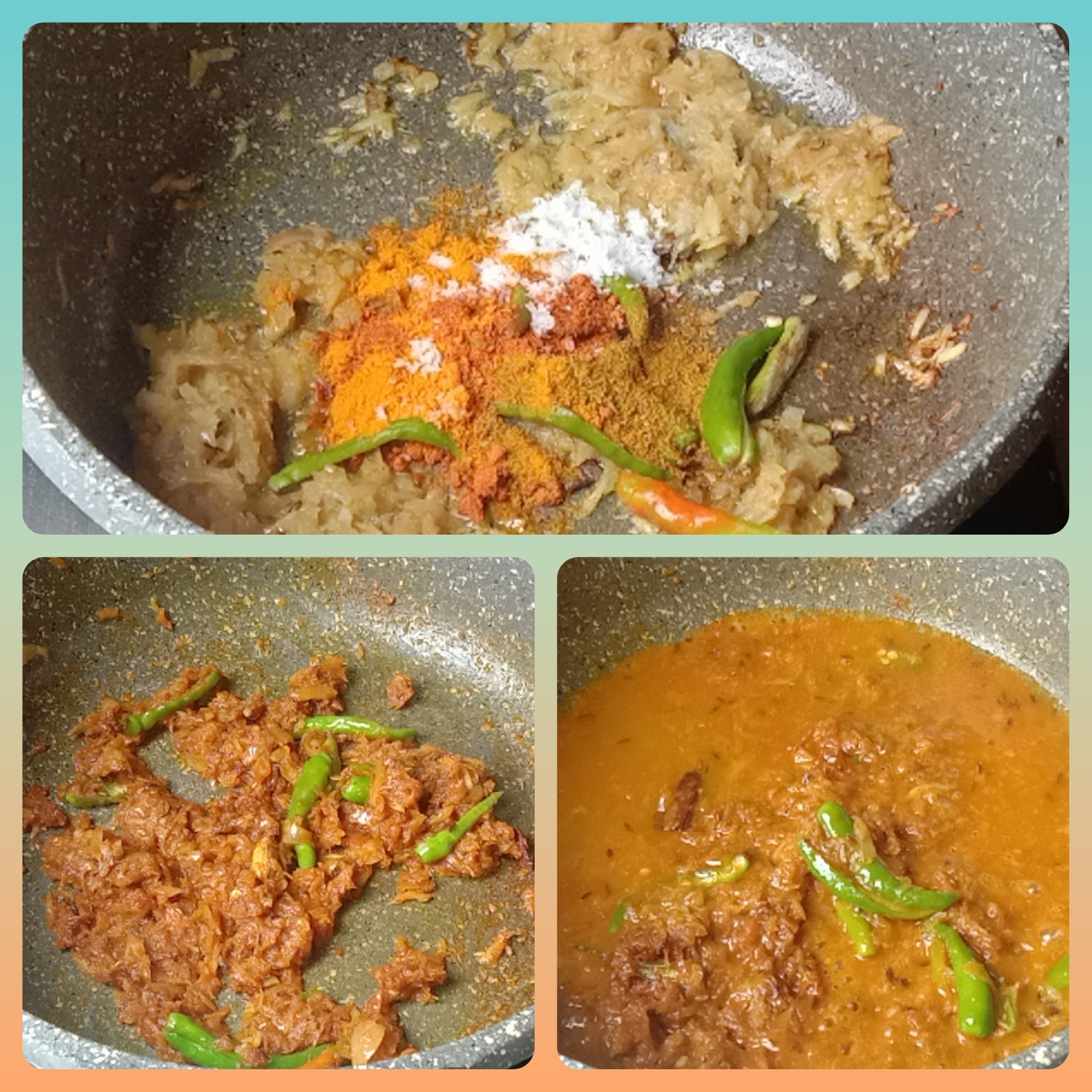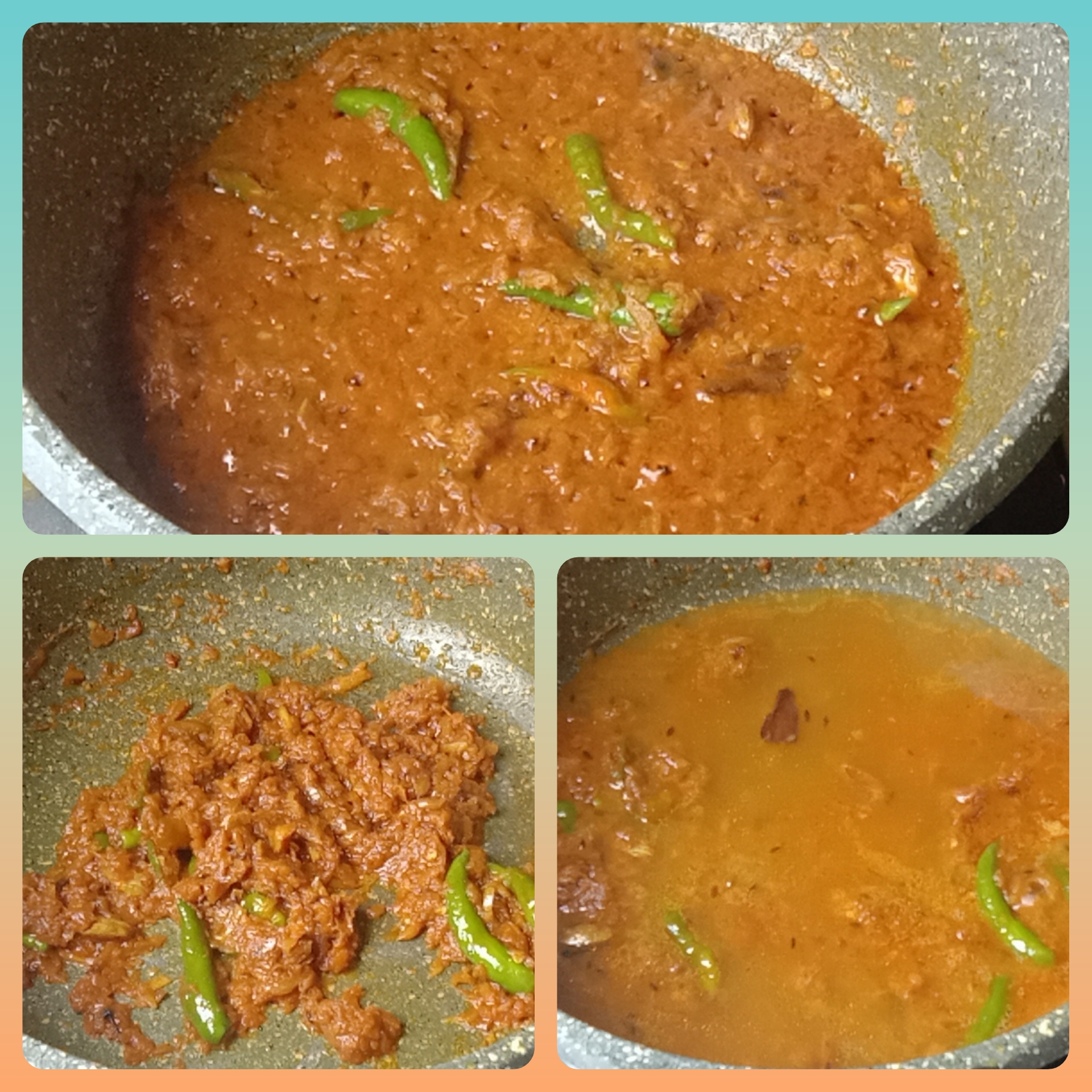 জল দিয়ে মসলা গুলো ভালো করে কষিয়ে নিলাম জল শুকিয়ে ভাজা ভাজা হলে,পরিমাণমতো জল দিয়ে ঝোল দিলাম।