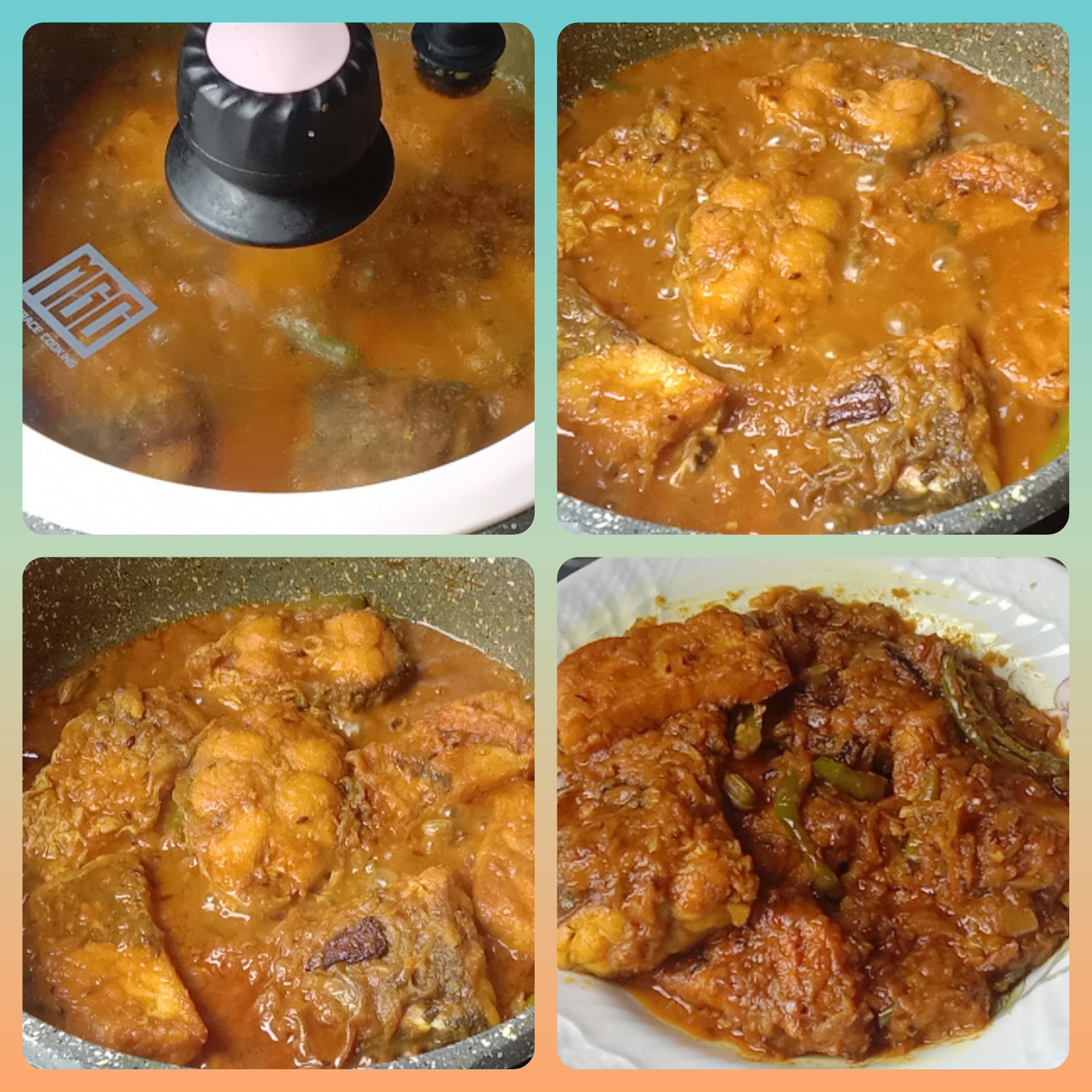 মাছ গুলো দেওয়ার পর আবার ঢাকনা দিয়ে ঢেকে কিছুক্ষণ রান্না করে নিলাম।কিছুক্ষণ পরে ঢাকনা খুলে অল্প আঁচে আরও কিছুক্ষণ রান্না করে নিলাম। ঝোল শুকিয়ে তেল যখন মাছের উপরে উঠে এসেছে তখন চুলার আঁচ বন্ধ করে একটা পাত্রে তুলে নিলাম।