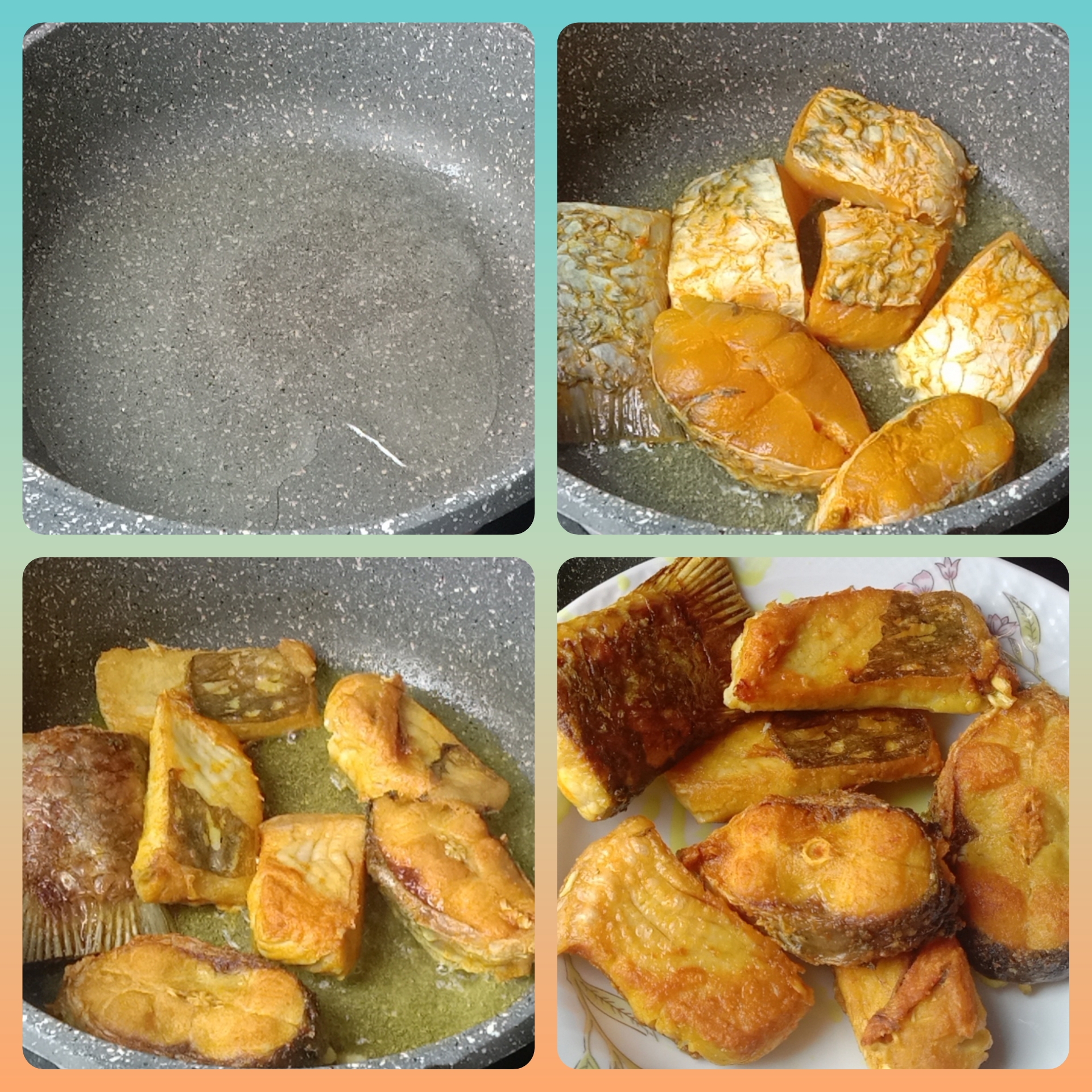 মাছের পিস গুলো একটা একটা করে করাই ছেড়ে দিলাম। কিছুক্ষণ রেখে একপাশে ভাজা হলে উল্টিয়ে দিলাম। দুপাশে ভালো করে মাছ গুলো ভালো করে ভেজে নিলাম।তারপর একটা পাত্রে তুলে নিলাম।