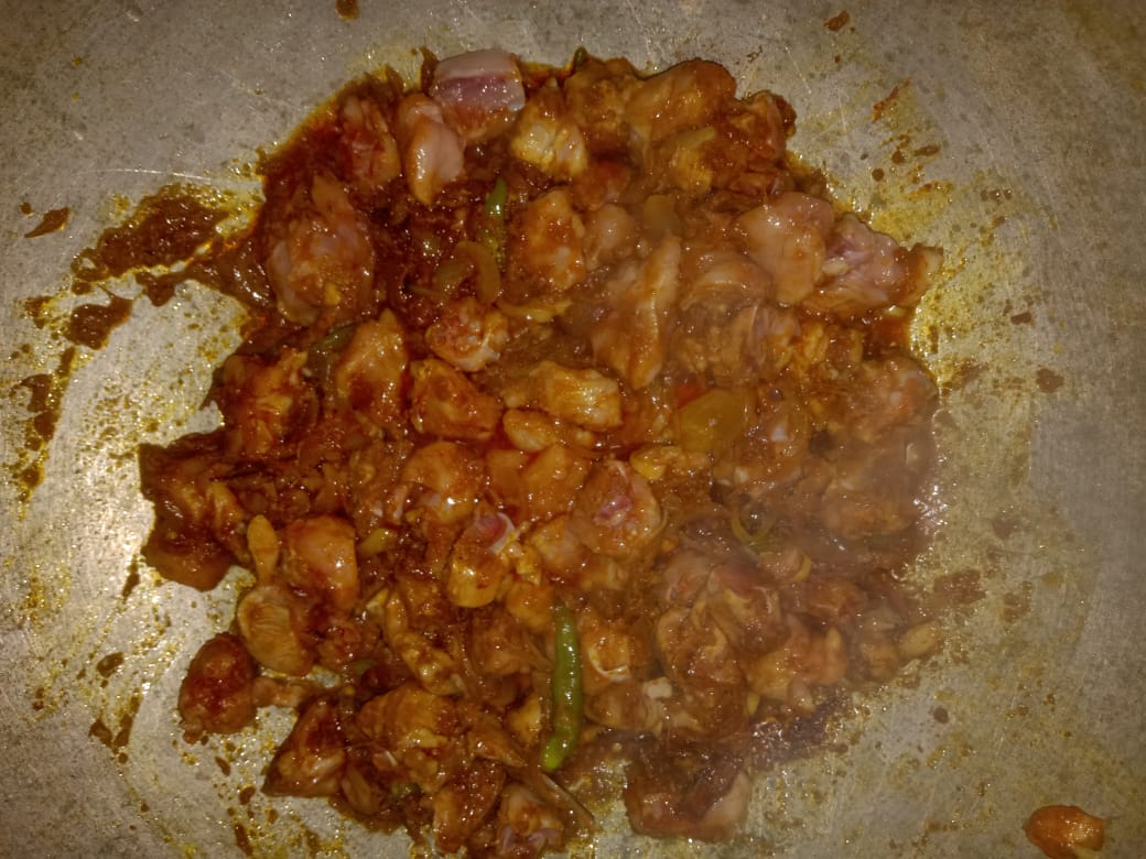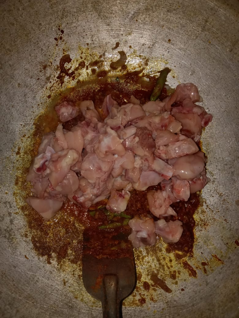 মুরগির মাংস দিয়ে দিব এখন কড়াই এর মধ্যে ।মুরগির মাংসগুলো আমি ছোট ছোট পিস করে কেটেছি । এগুলো এখন পেঁয়াজ মসলার মধ্যে দিয়ে দিয়েছি এবং ভালো করে সেই সাথে মিশিয়ে নিয়েছি।