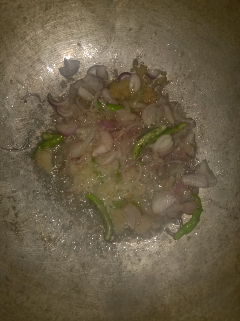 প্রথমে আমি কড়াই এর মধ্যে তেল গরম করতে দিয়েছি। তারপর পেয়াজ কুচি, লঙ্কা কুচি, আদা রসুন বাটা ইত্যাদি দিয়ে দিয়েছি কড়াই এর মধ্যে।