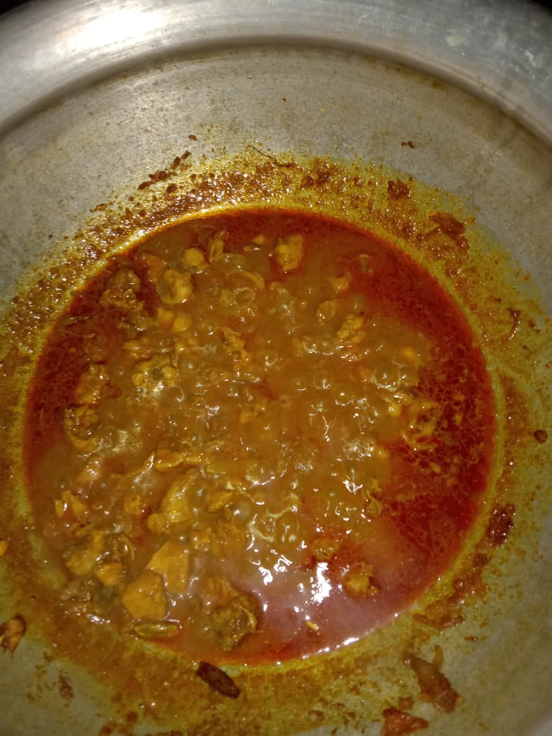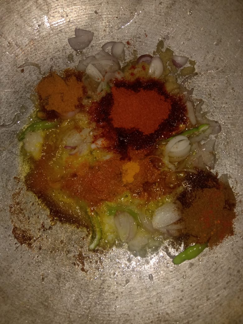 এরপর আমি কড়াই এর মধ্যে দিয়ে দিলাম লবণ ,হলুদ ,মরিচ, মসলা সবকিছুই পরিমাণ মতো দিয়ে দিয়েছি। সবকিছু একসাথে মিশিয়ে কিছুক্ষণ কষিয়ে নিলাম।