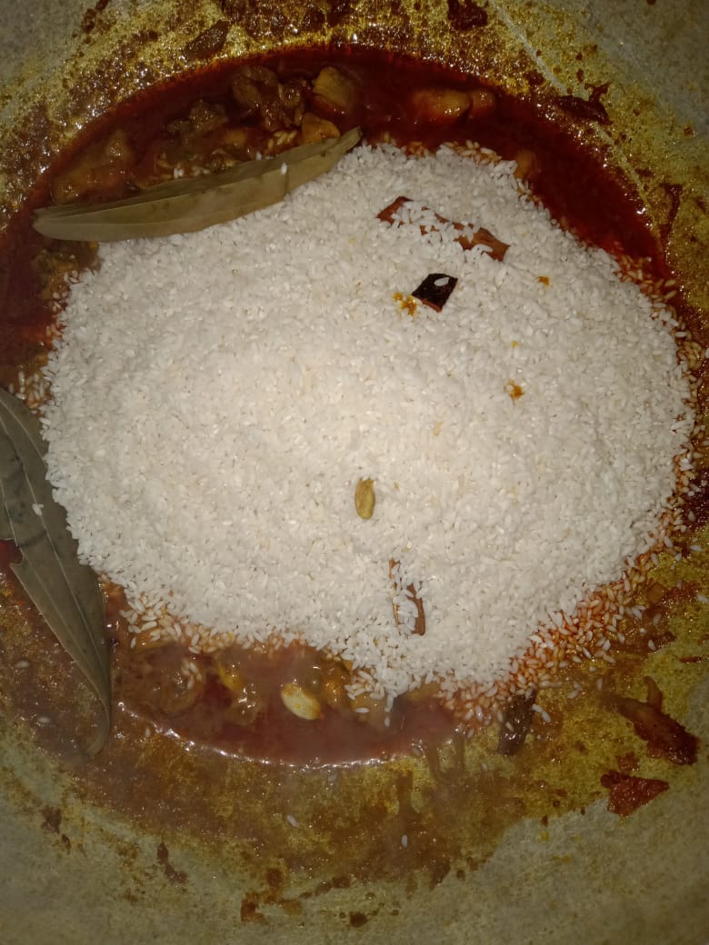 কড়াই এর মধ্যে পানিগুলো সামান্য শুকিয়ে এসেছে এবং মাংস গুলোও রান্না হয়ে এসেছে। এ পর্যায়ে আমি দিয়ে দিলাম চাল। চালের সাথে আমি এলাচ, দারুচিনি, তেজপাতাও দিয়ে দিয়েছি।