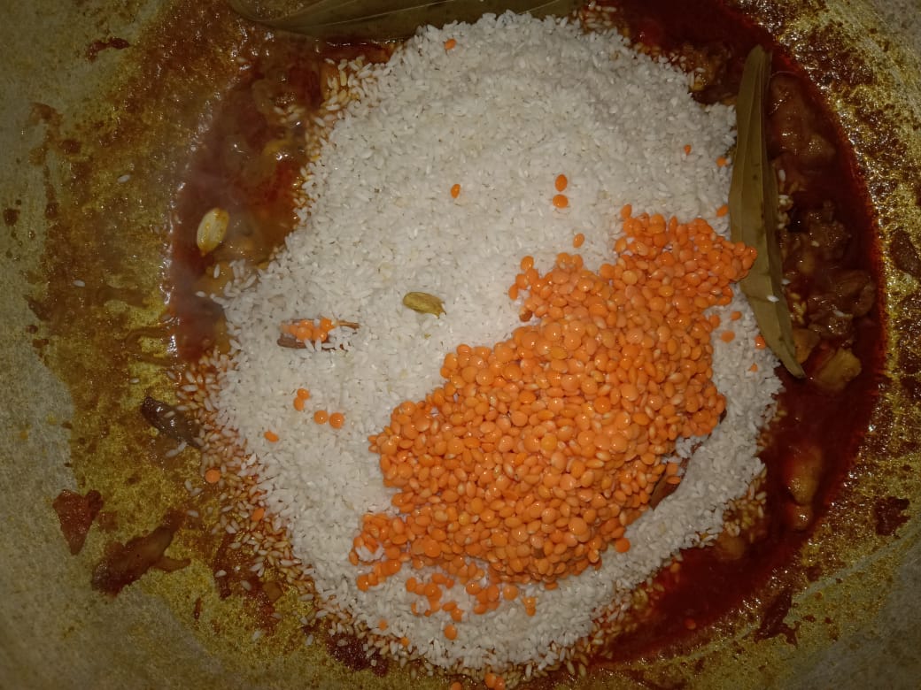 চাল দেওয়ার পর আমি চালের উপর ডালগুলো দিয়ে দিলাম। ডালগুলো আমি আগে থেকে পরিষ্কার করে ধুয়ে নিয়েছি। এরপর আমি চাল , ডাল ও মাংসগুলো একসাথে মিশিয়ে নিয়েছি ভালো করে।