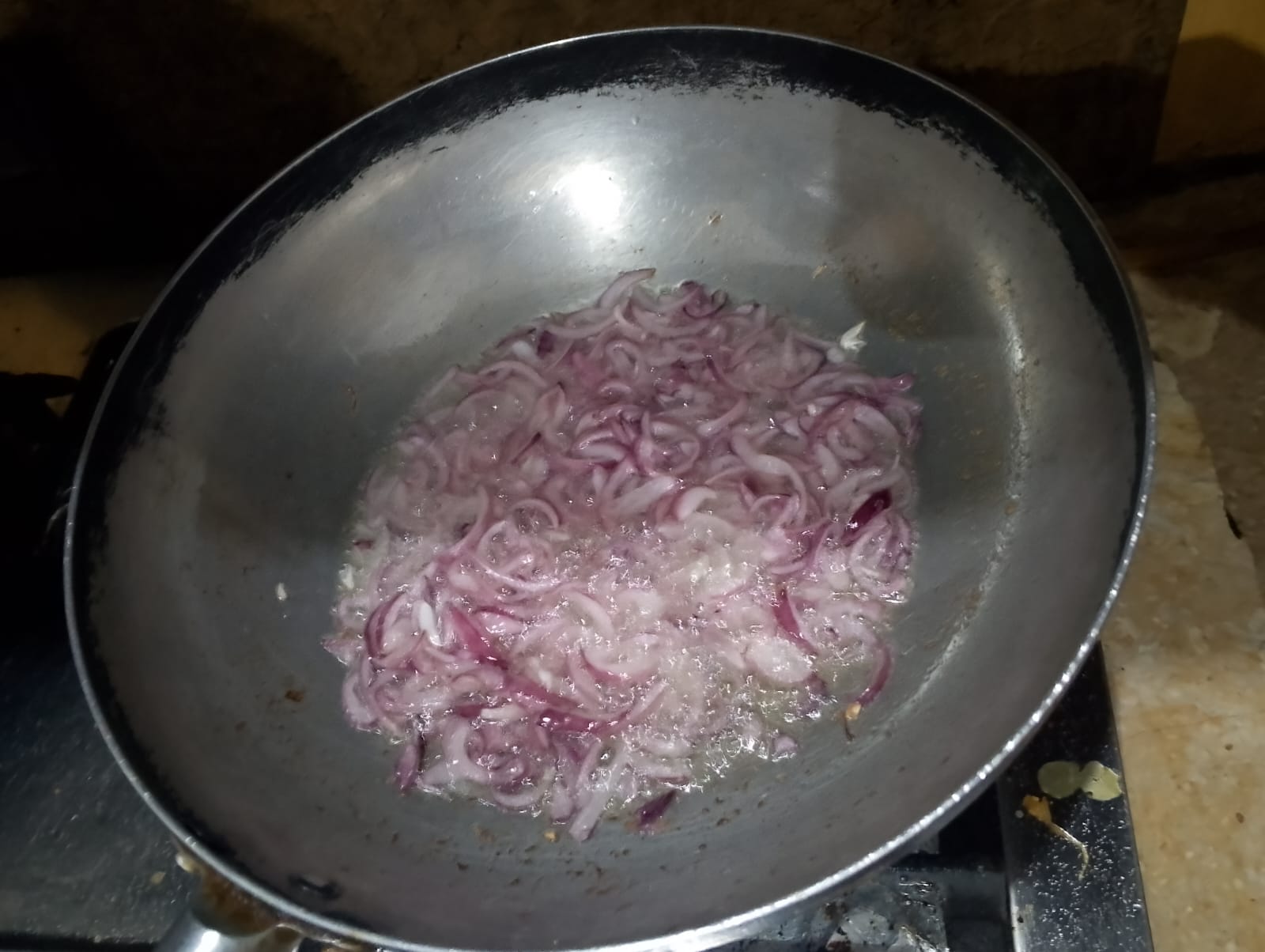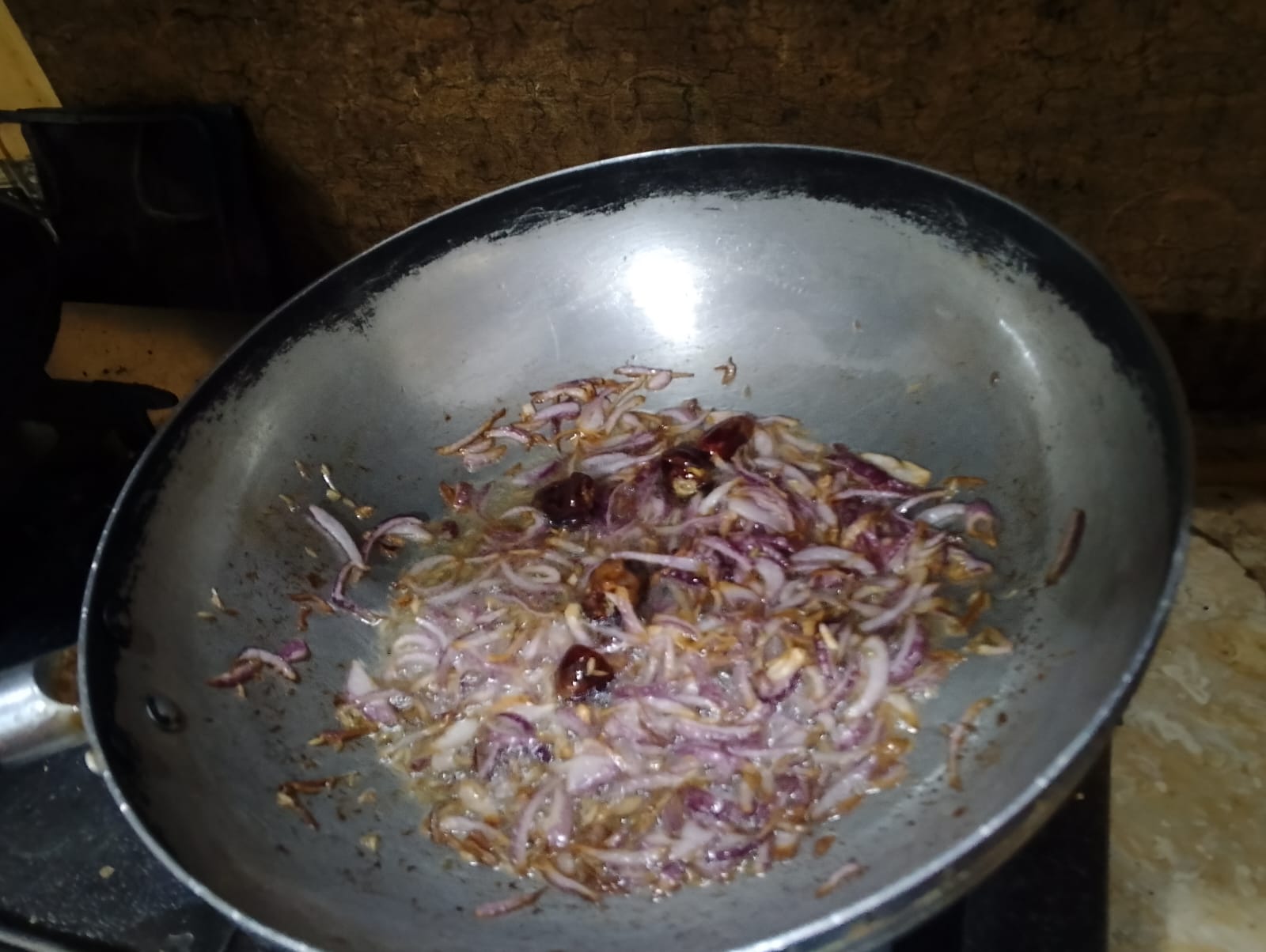 - When onion turns pink in color and started its aroma then put cumin seeds and red whole chilli into it.