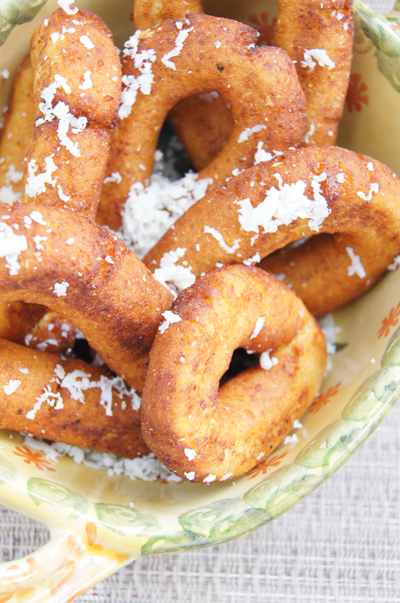 These breakfast snacks are a corn ring that can be enjoyed while still hot, with butter and cheese. It is made of corn meal, grated queso blanco (hard, salty, white cheese), sugar or Papelón, which is the molasses-like sugar left over from sugar cane processing and mashed plantain that must be very ripe when used – look for yellow plantains, which is the color in between green (unripe) and black (very ripe).