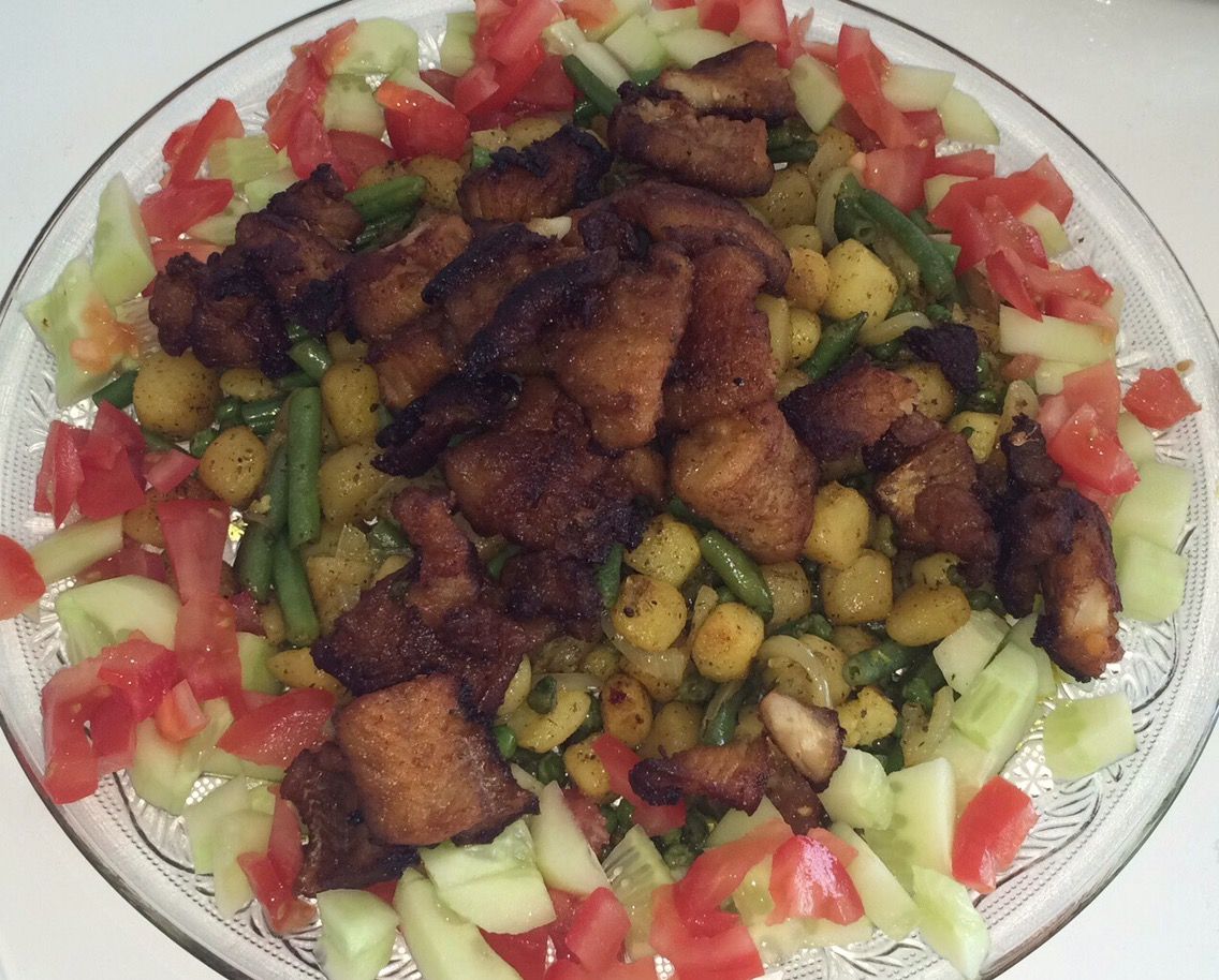 When the potatoes are ready add them to the pan and bake for 7 minutes or so. Put the fried cod bits in another pan an bake them for about 4 minutes. In the meantime cut some tomatoes and cucumber. Get a big plate, put the mix of beans and potato on the plate. Put the tomato and cucumber around the potatoes. Put the cod bits on top and the dish is ready to be served.