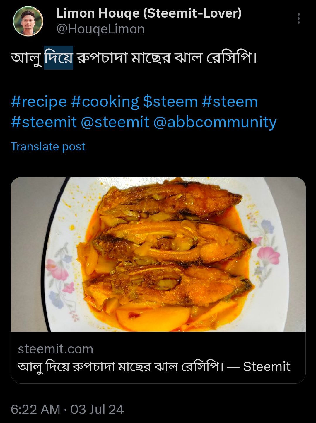 আলু দিয়ে রূপচাঁদা মাছের সুন্দর একটা রেসিপি তৈরি করে আপনি আমাদের মাঝে জয় করেছেন ভাইয়া। সত্য কথা বলতে খুব প্রধান মাছ খেতে আমার কাছে খুবই ভালো লাগে। আপনি যেভাবে লোভনীয় পদ্ধতিটা তৈরি করেছেন আমাদের মাঝে শেয়ার করেছেন তা দেখেই আমার কাছে ভালো লাগছে।