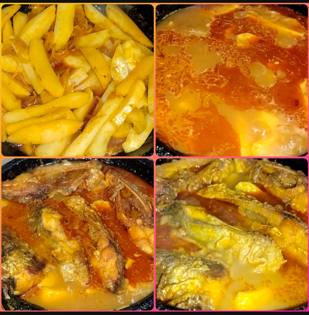 - এবার আমি ঢাকনা দিয়ে ঢেকে রাখলাম। কিছুক্ষণ পর ঢাকনা খুলে নেড়েচেড়ে নিলাম। আলু গুলোকে কষিয়ে নেওয়ার পর পরিমাণ মতো পানি দিয়ে দিলাম। এর পরে ঢাকনা দিয়ে ঢেকে রাখলাম। কিছুক্ষণ পর ঢাকনা খুলে ভেজে রাখা মাছ গুলোকে দিয়ে দিলাম। এর পরে কিছুক্ষণ রান্না করে নিলাম। এর পরে এখানে রান্না শেষ করলাম।