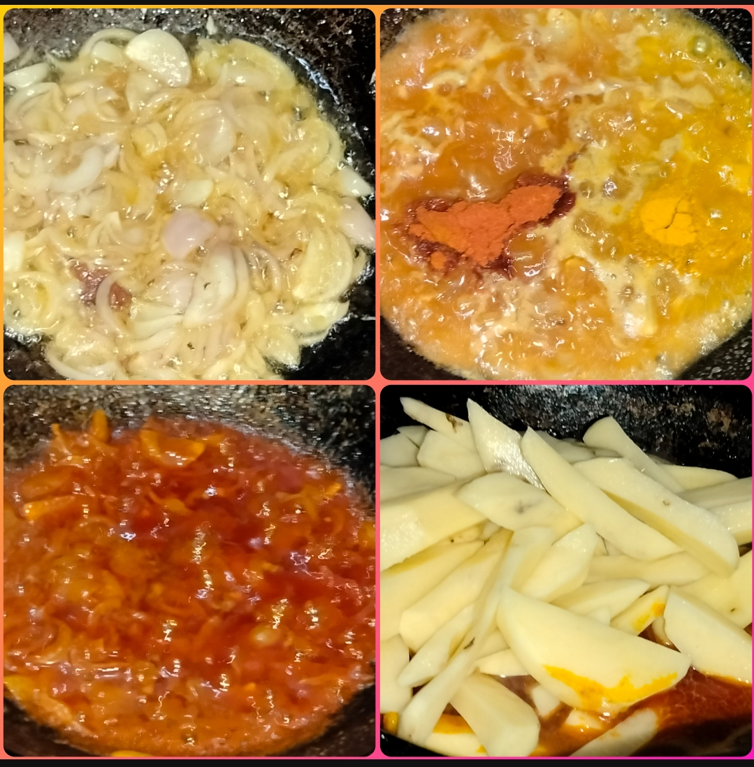- এবার আমি পেঁয়াজ কুচি দিয়ে হালকা করে ভেজে নিলাম। তার পরে সামান্য পরিমাণ পানি দিয়ে দিলাম। এবার আমি সমস্ত মসলা গুঁড়া দিয়ে মিশিয়ে নিলাম। কিছুক্ষণ মসলা গুলোকে ভালো করে কষিয়ে নিলাম। এর পরে আলু গুলোকে দিয়ে দিলাম। আলু গুলোকে ভালো করে মিশিয়ে নিলাম।