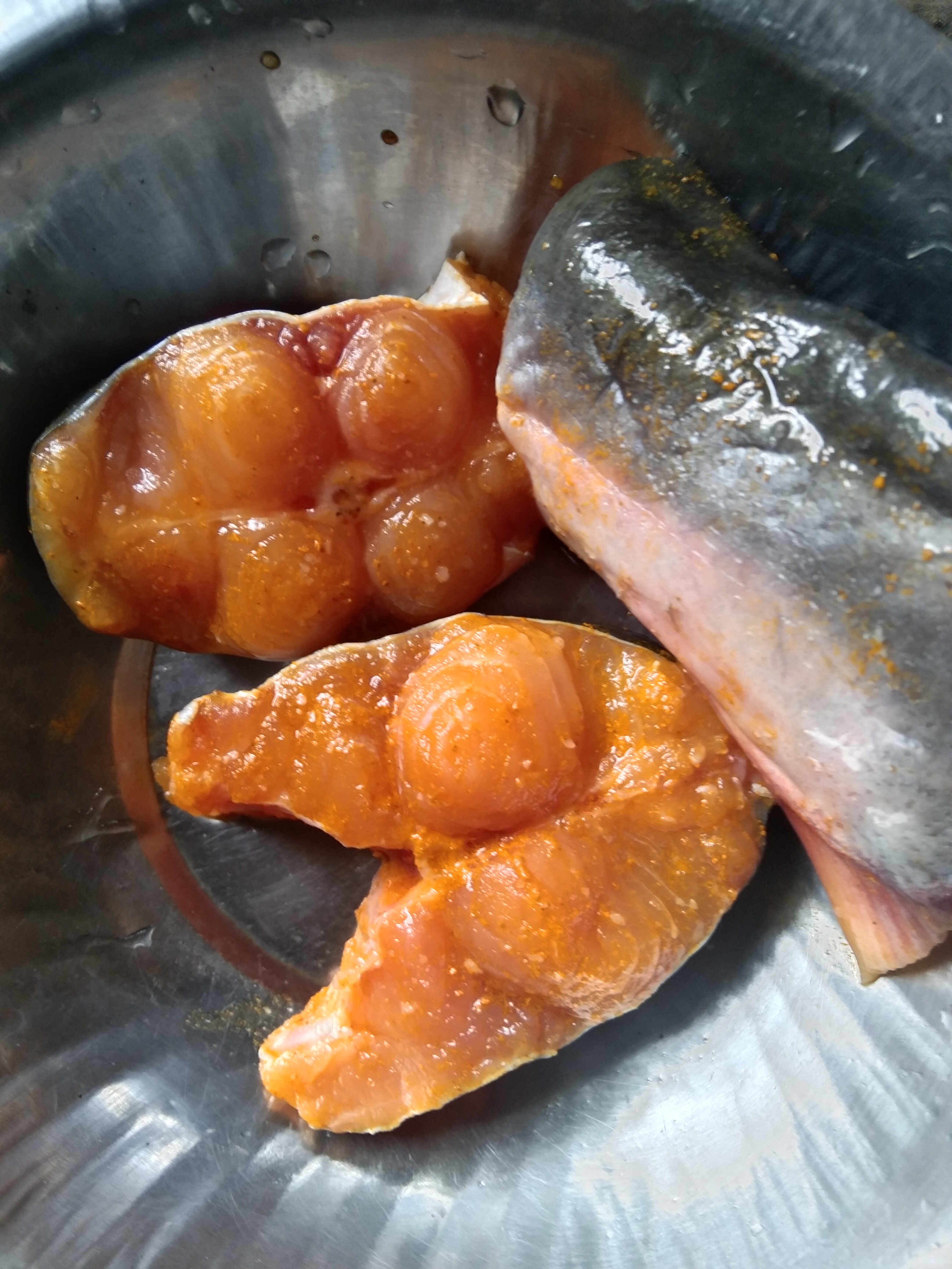 এবার আমি পরিমাণমতো হলুদের গুড়া ,পরিমাণমতো লবণ ,পাঙ্গাস মাছে মাখিয়ে নিব ভাজার জন্য।