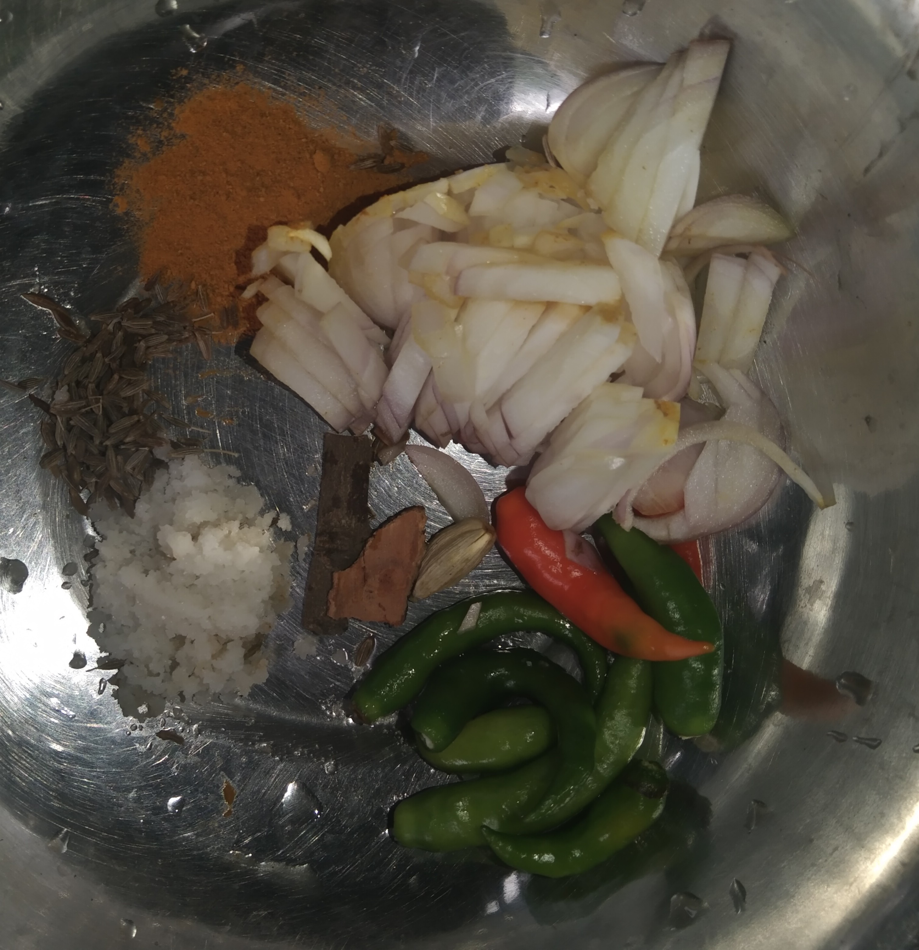 এবার আমি পরিমাণমতো কাঁচা মরিচ ,পরিমাণমতো হলুদের গুড়া ,পরিমাণমতো লবণ ,পরিমাণমতো পেঁয়াজ কুচি, পরিমাণ মতো জিরা, পরিমাণমতো দারচিনি, পরিমাণমতো এলাচ নিয়ে নিব।