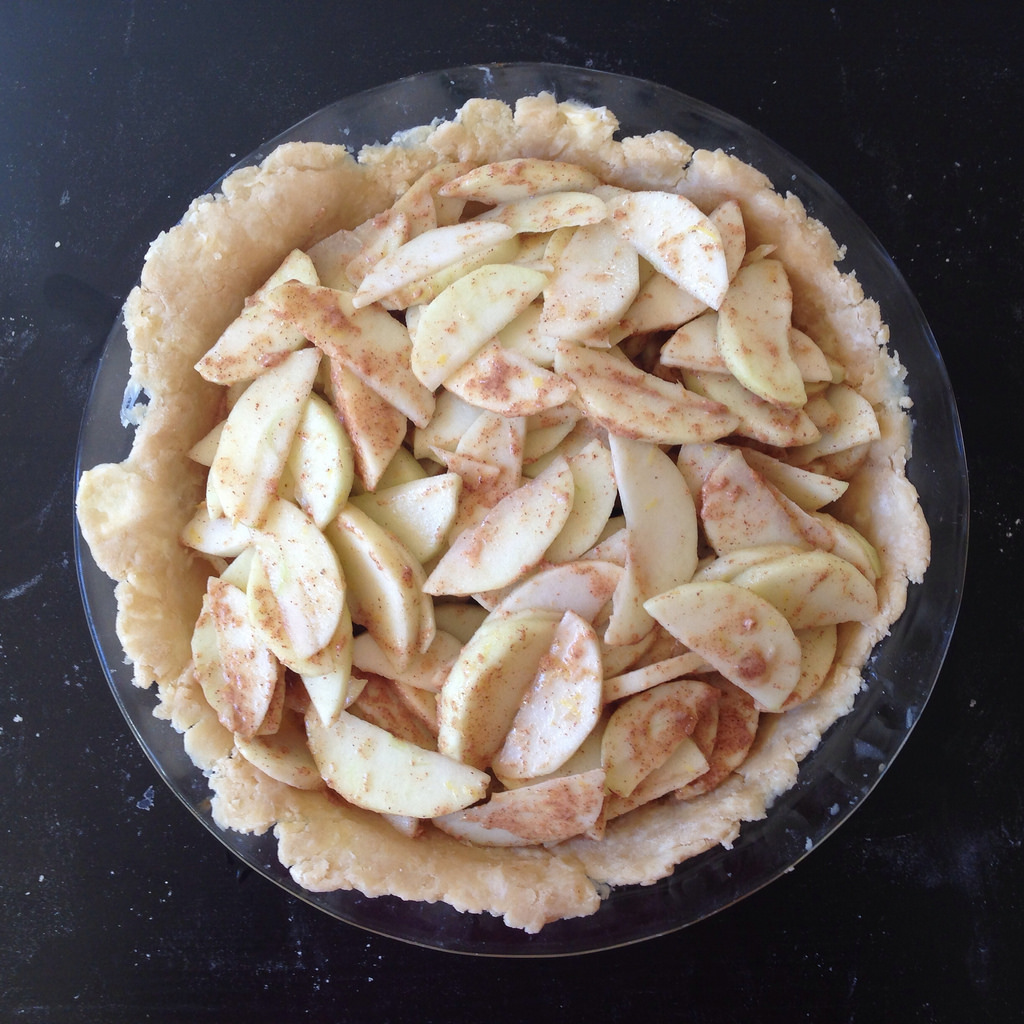 Peel the apples and peel and cut into small pieces. Add lemon juice, half cinnamon, salt, 2 tablespoons of flour and 220 g of brown sugar to them.