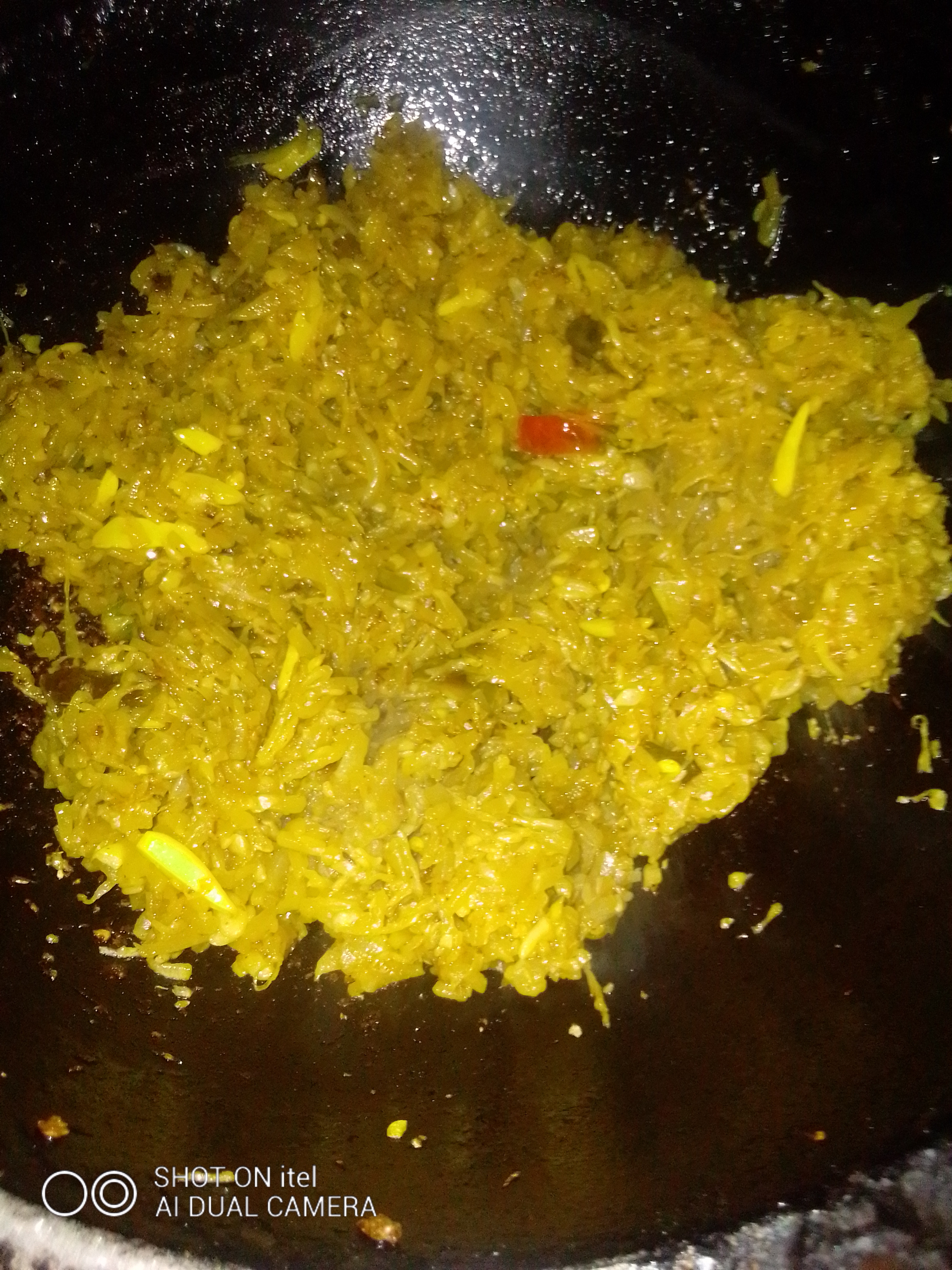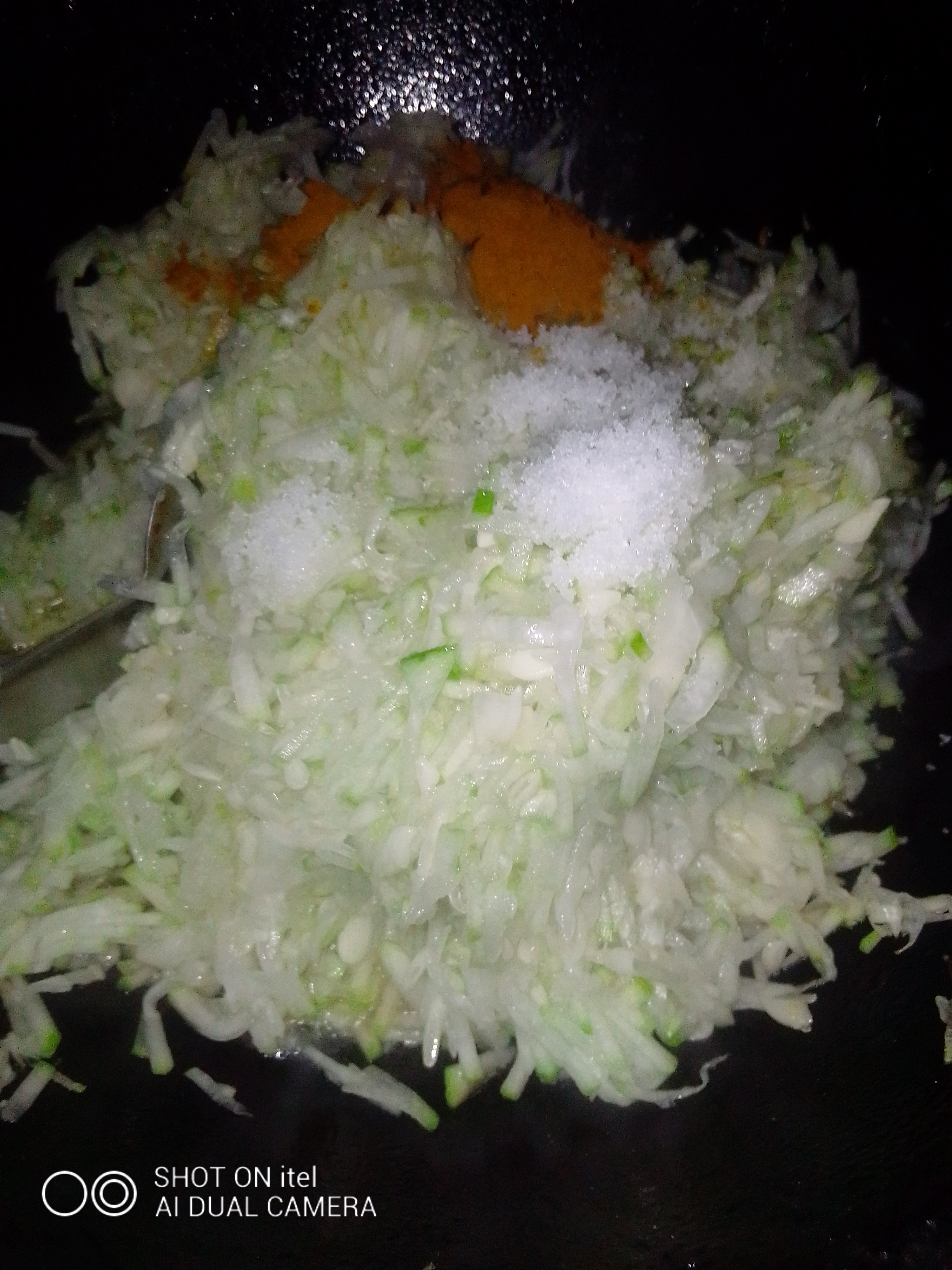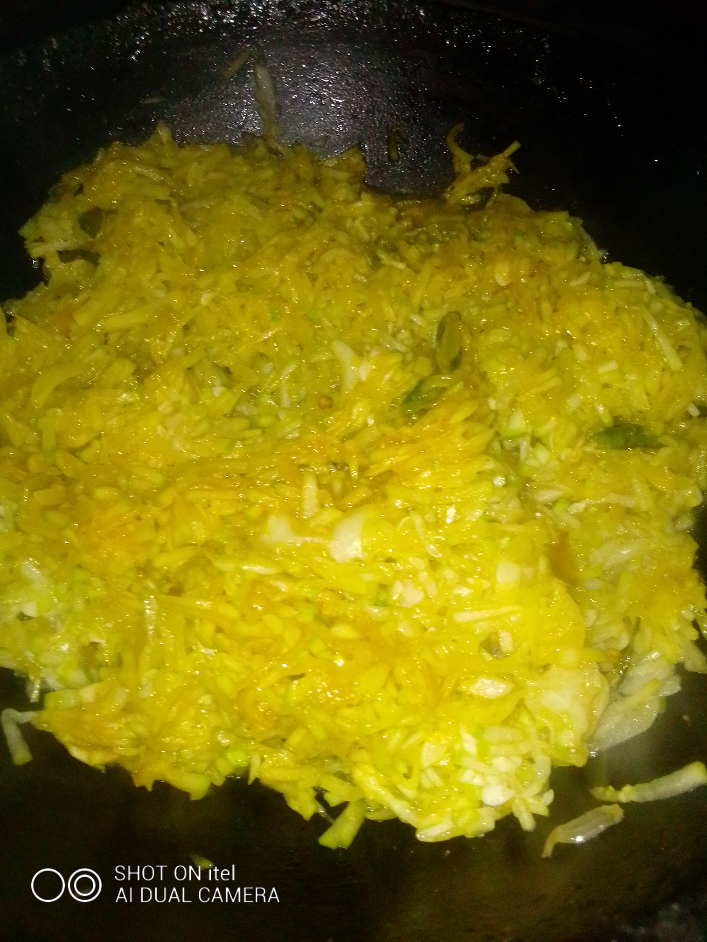 তারপর মাখিয়ে রাখা চাল কুমড়ো তেলের উপর ছাড়ার পর তাতে একে একে হলুদগুড়া ও লবণ দিয়ে ভালো করে নাড়তে হবে।